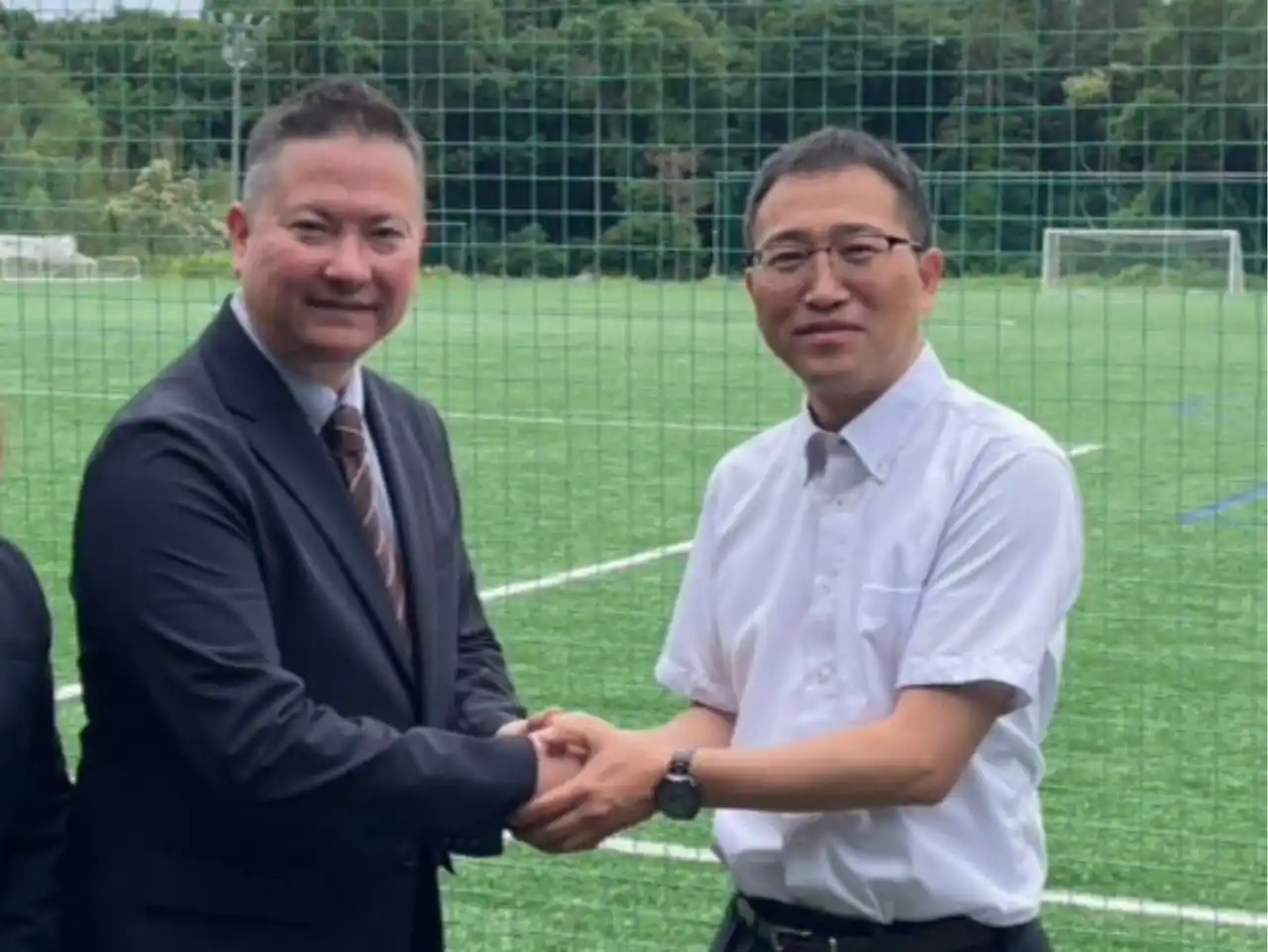 つくばFCとつくばヘレナ高等学院による教育支援パートナー協定締結時 2025年6月 つくばFC万博グラウンドにて)「左から つくばヘレナ高等学院 理事長 松本マーク、つくばフットボールクラブ 代表 石川慎之介氏」 |