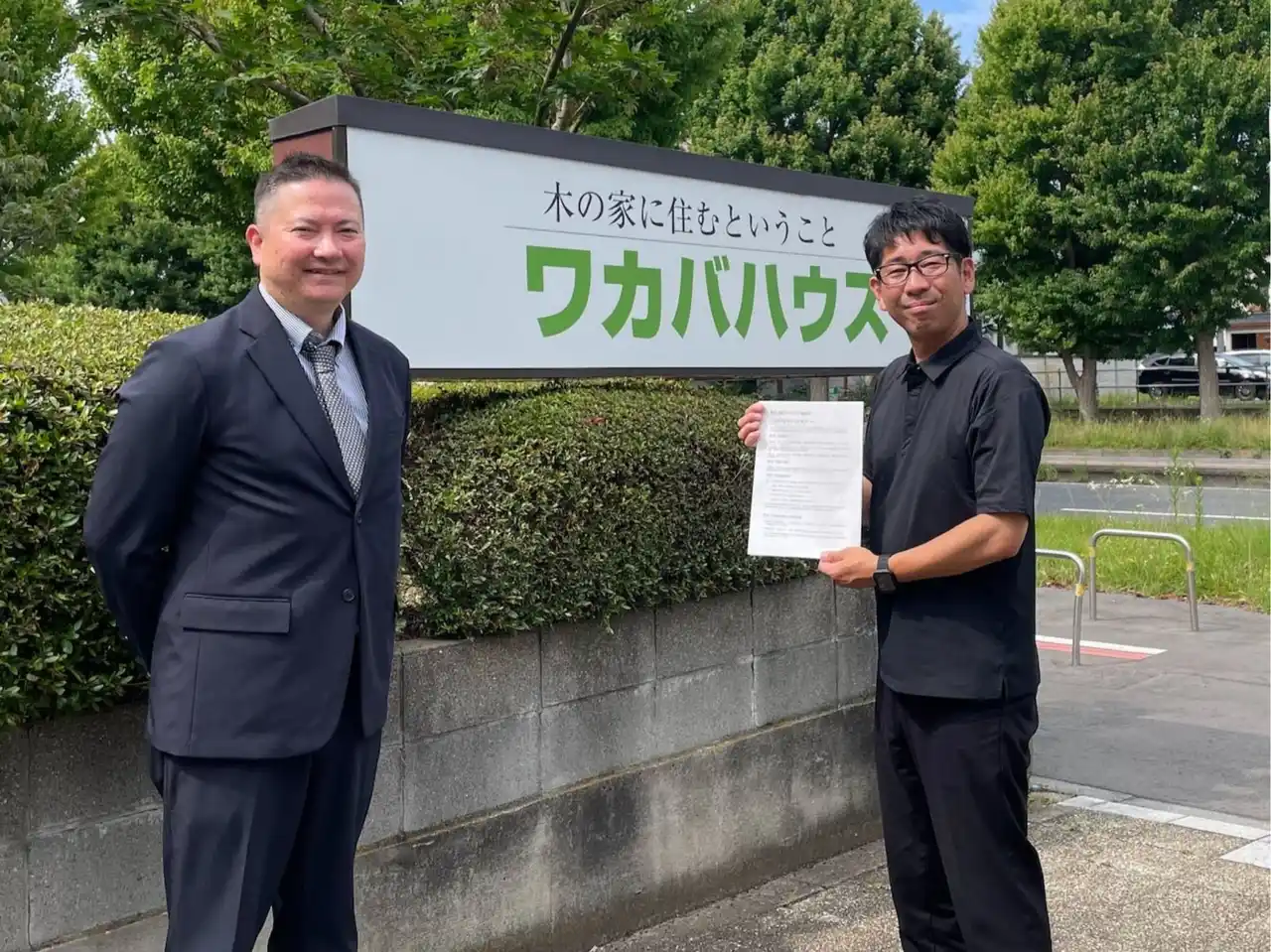 ワカバハウスとつくばヘレナ高等学院による教育支援パートナー協定締結時 (2025年6月 ワカバハウス本社前にて)「左から つくばヘレナ高等学院 理事長 松本マーク、ワカバハウス 代表取締役 中山和彦氏」 |