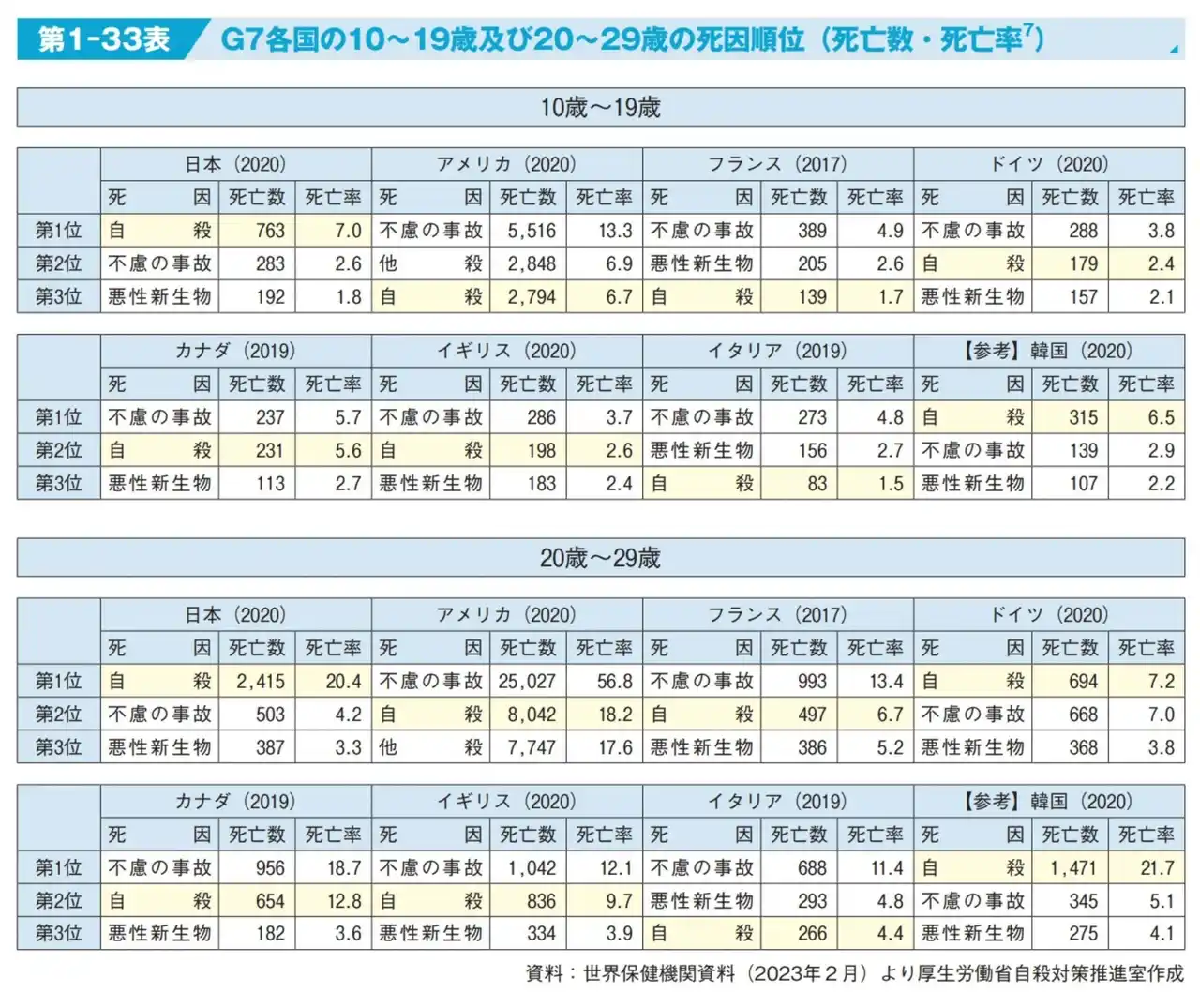 さらに、厚生労働省のデータによると、10~39歳の死因の第1位が自殺であり、G7諸国で10~19歳の死因第1位が「自殺」なのは日本のみとなっています。若者の心の危機は深刻さを増しています。 |