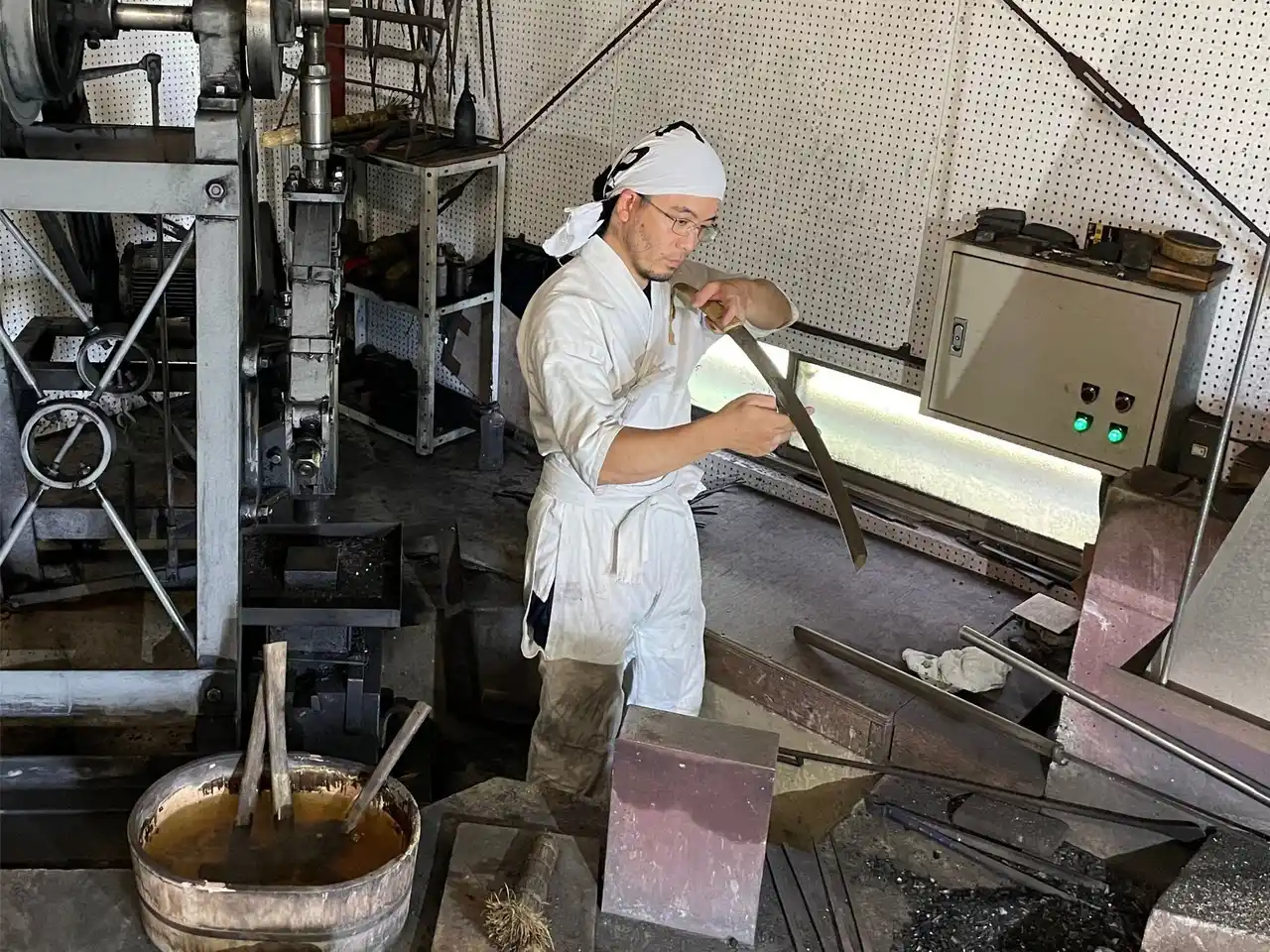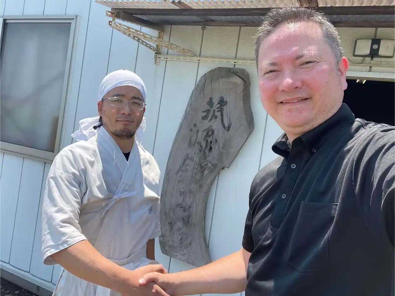 刀剣作家 宮下 正吉氏とつくばヘレナ高等学院による教育支援パートナー協定締結時(2025年7月 筑波鍛刀場前にて)「左から 刀剣作家 宮下 正吉氏、つくばヘレナ高等学院 理事長 松本マーク」 |