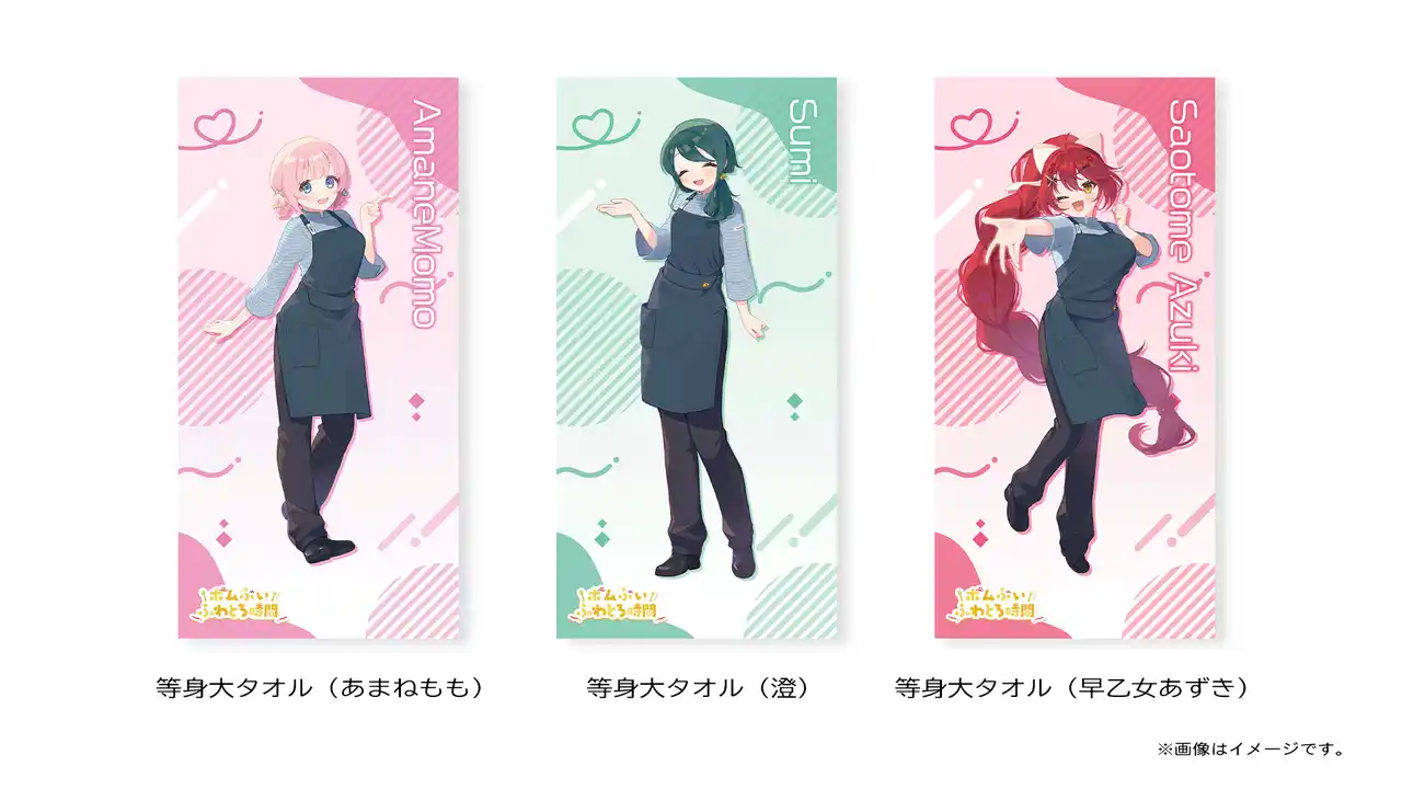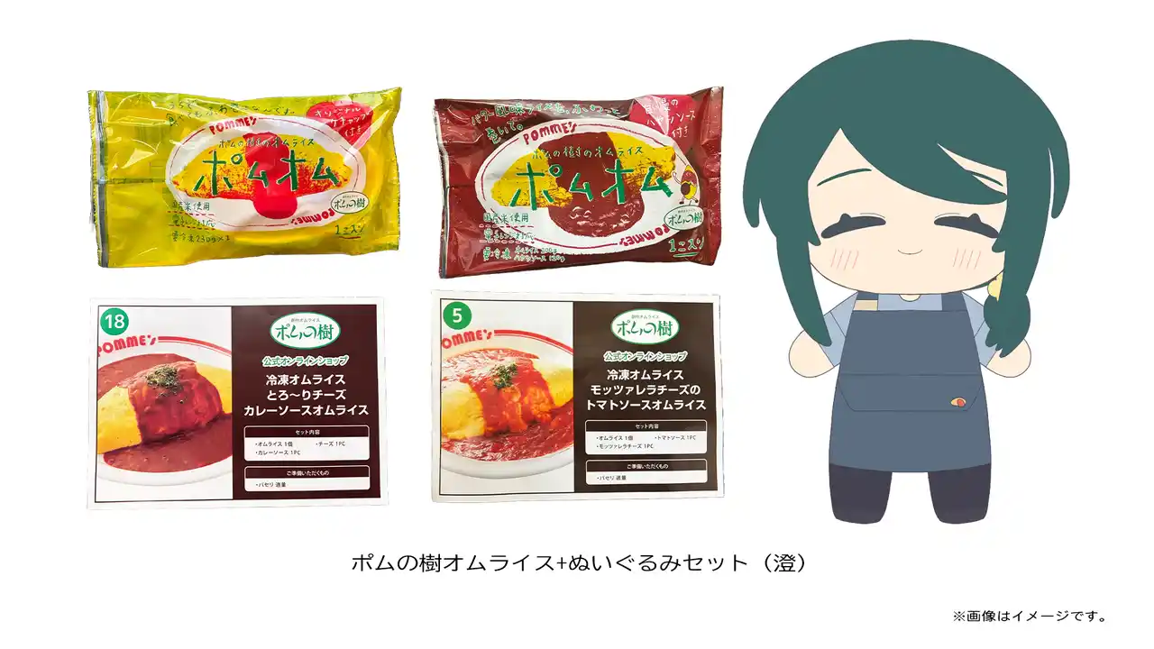 本企画では「メイドインヘブン」公式ECサイトでも販売を行い、ぬいぐるみ付き冷凍オムライスセットや等身大タオル、3名集合デザインのブランケット、缶バッジなど、全9種類のオリジナルグッズを展開しました。いずれも「ポムの樹」の制服を着た3名の描き下ろしイラストを使用しています。 |