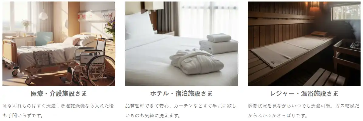 自社内に置ける業務用機器なら、欠品や遅延の心配を減らしリネンの安定供給を実現しながら、急な汚れものの洗濯といった稼働へもスムーズに対応でき、フレキシブルな運用が可能です。 |