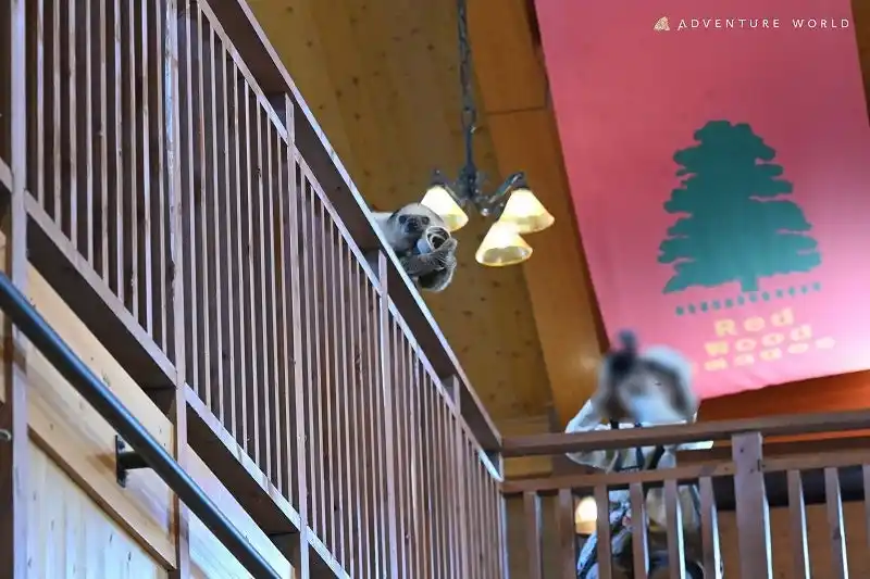 皆様に見られながら、ナマケモノのこどもが登場したのは・・・なんと2階から! |