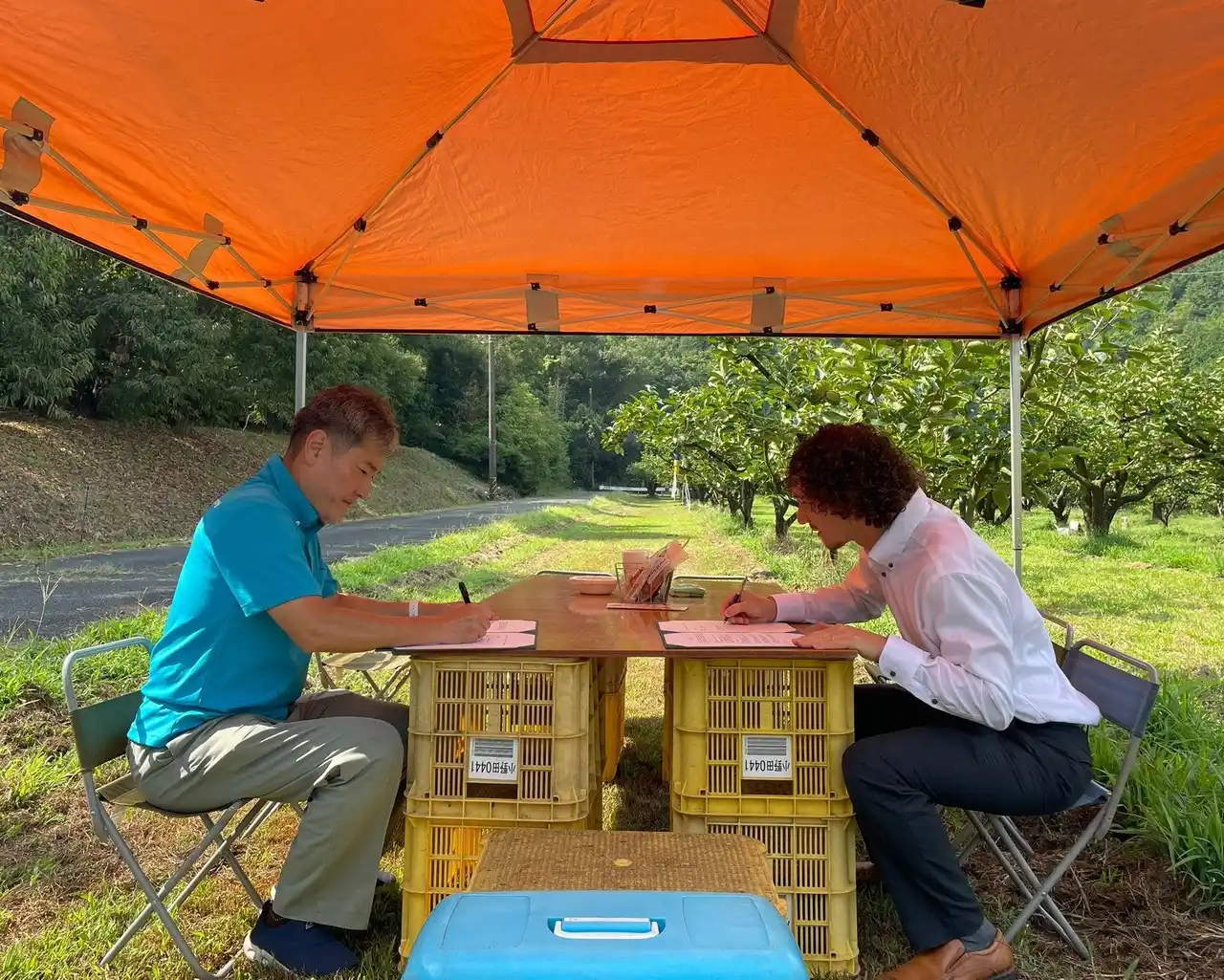 豊橋市石巻萩平町内の柿農園にて、翠(すい)色のAdamとともに記念撮影に応じる両氏 |