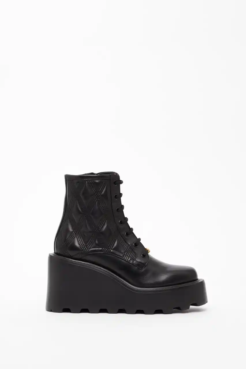冬らしいひねりを加えたカジュアルなウエッジソールのコンバットブーツは、キルティングナッパレザーで作られています。シューレースには、アンティーク真鍮仕上げの取り外し可能なVロゴ シグネチャー モチーフがあしらわれ、個性的な雰囲気を醸し出しています。 |