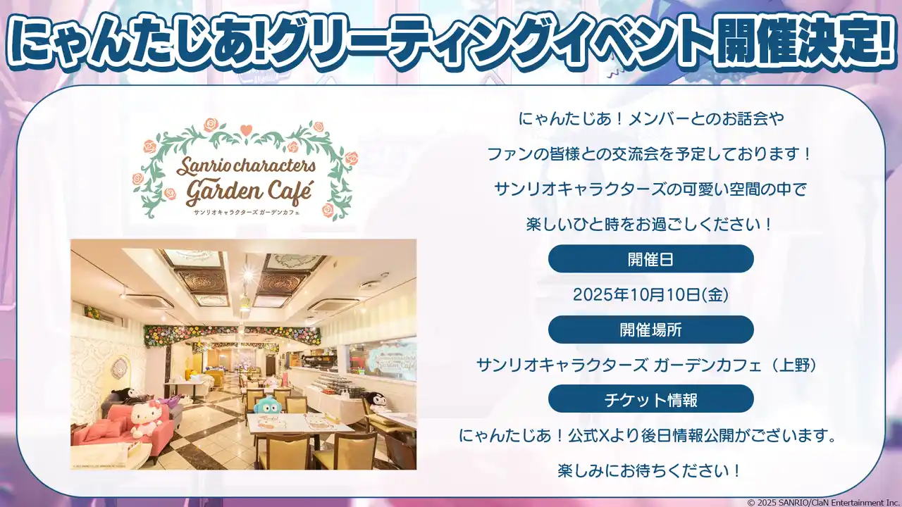 にゃんたじあ!メンバーとの1対1のトークやファンの皆様との交流会を実施する、グリーティングイベントの開催が決定いたしました! |