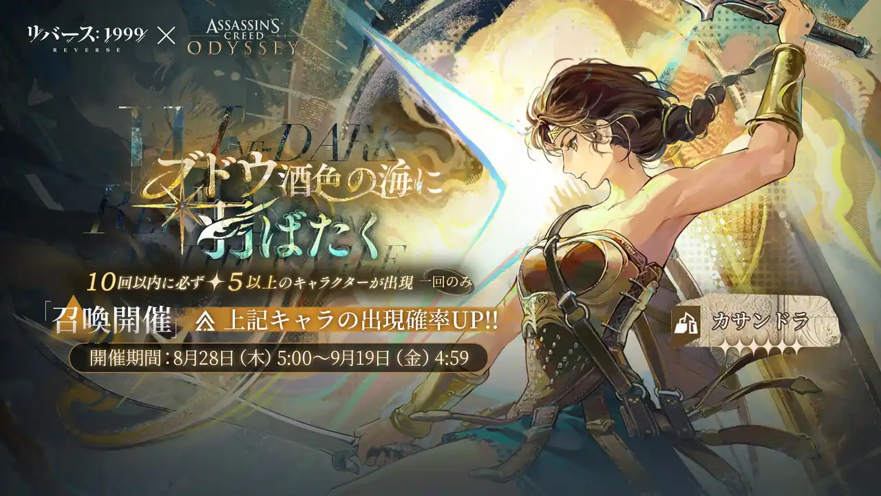 古代ギリシアを舞台とした『アサシンクリード』コラボ後半戦でも活躍する新キャラクター「カサンドラ(CV.清水理沙)」をピックアップしたコラボ召喚「ブドウ酒色の海に羽ばたく」を開催中です。 |