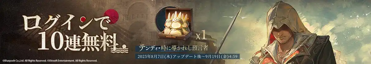 『アサシンクリード』コラボ開催中は様々なログインボーナスが開催されます。 |