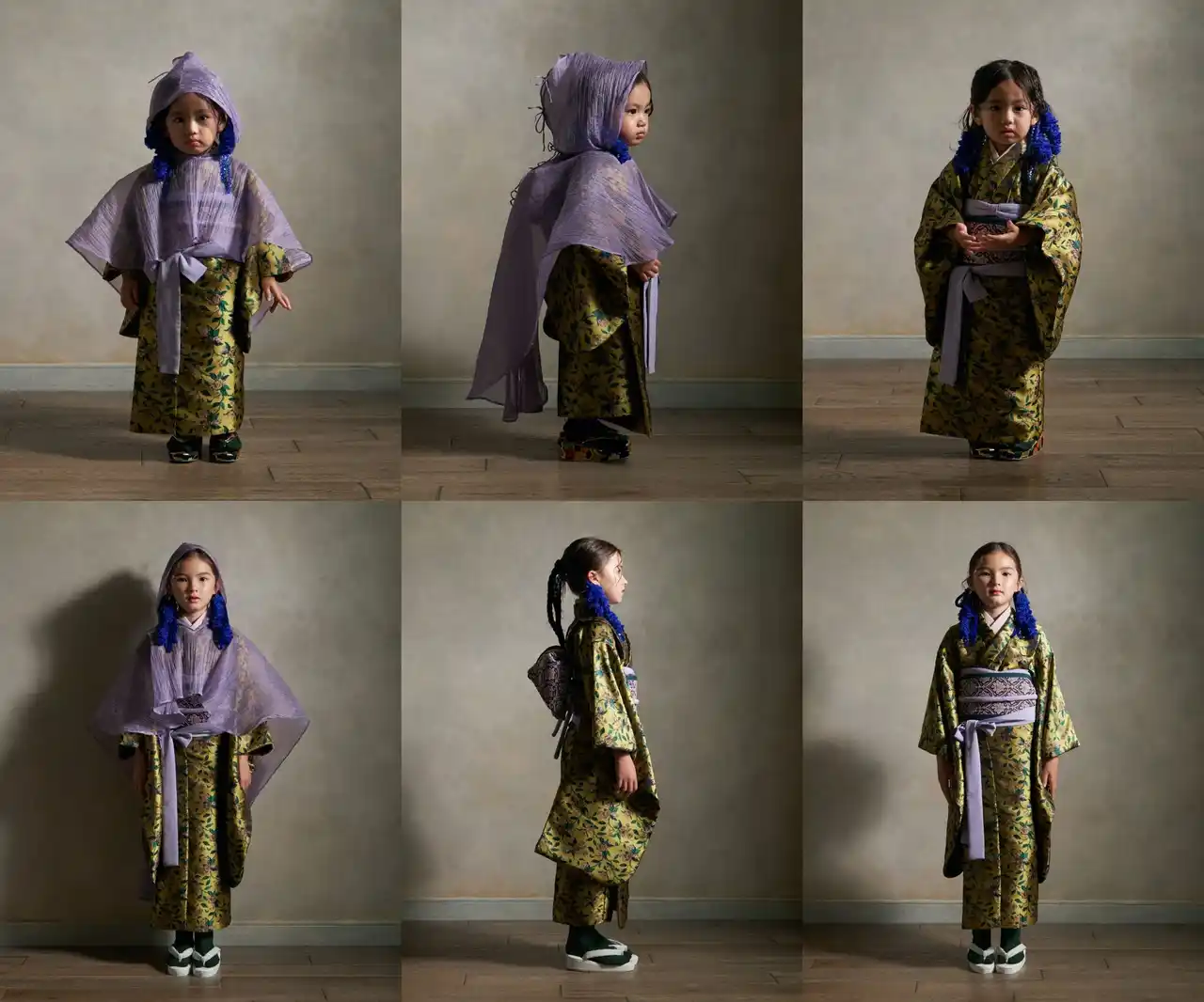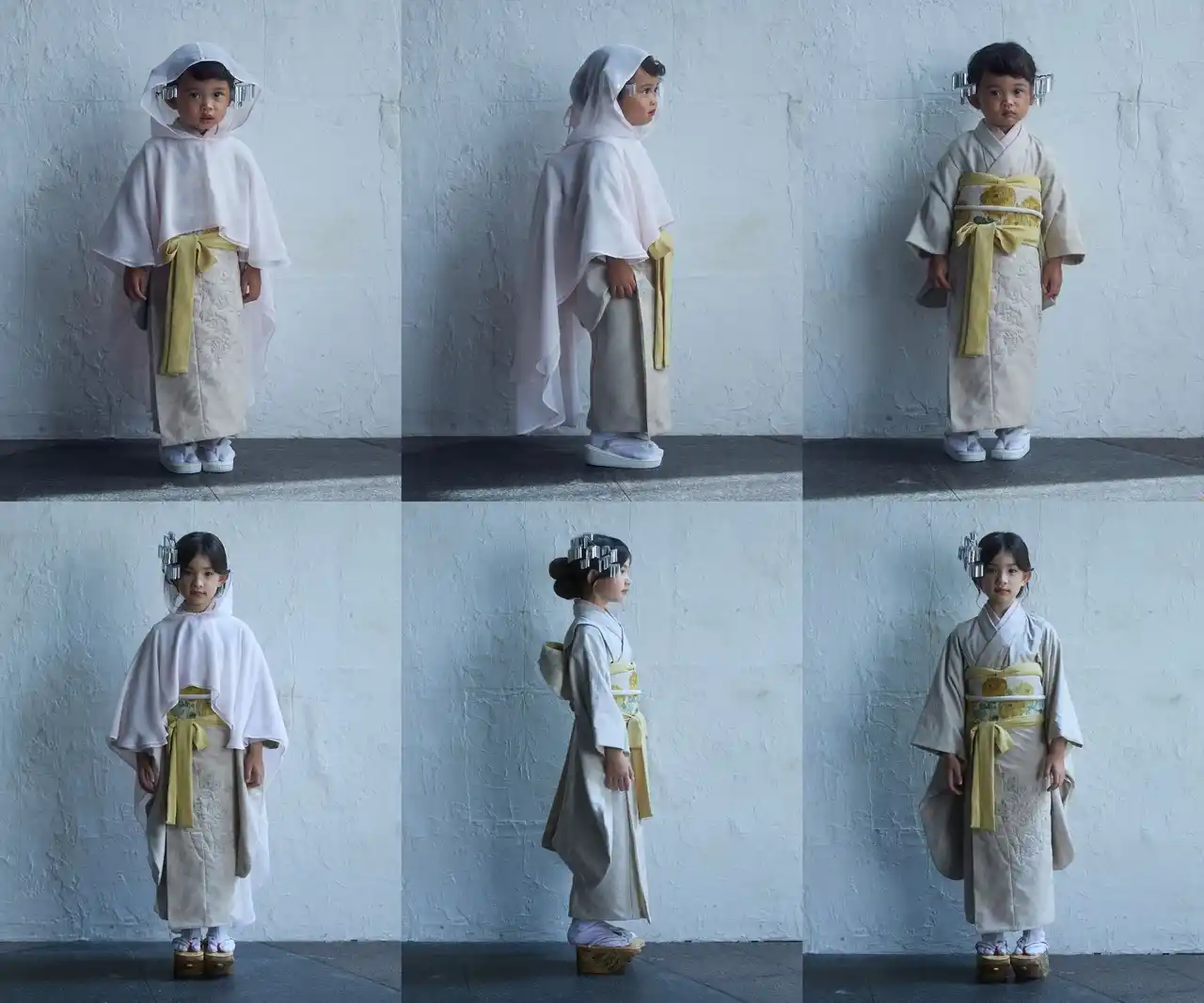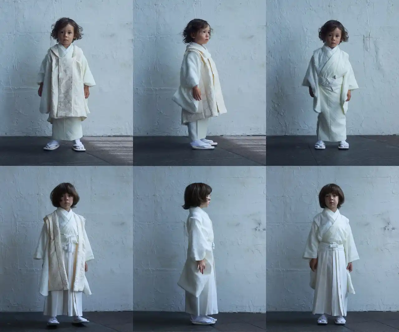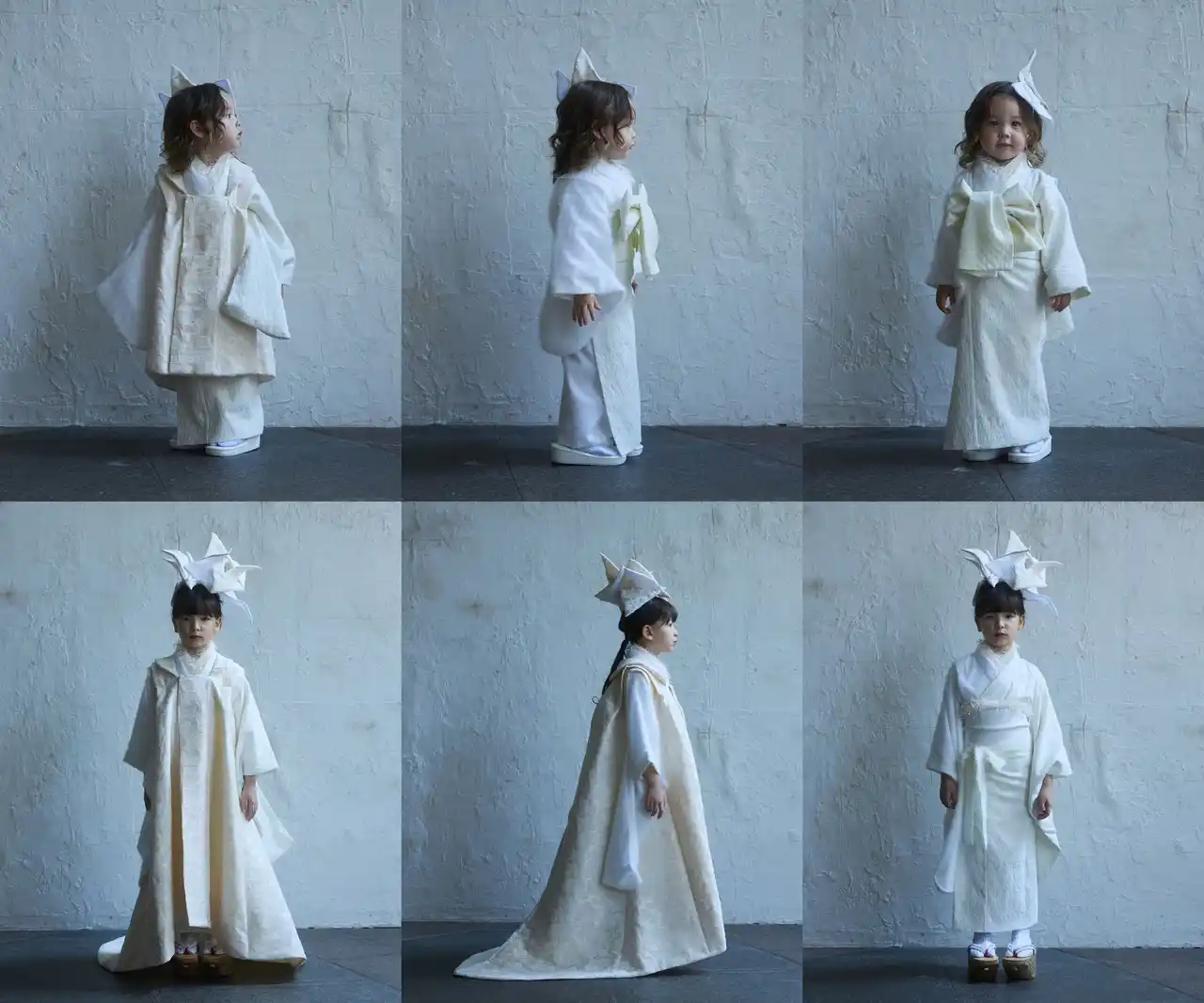和装の品格と白のグラデーションが、お子さまの純粋な美しさを引き出すスタイリングです。 |