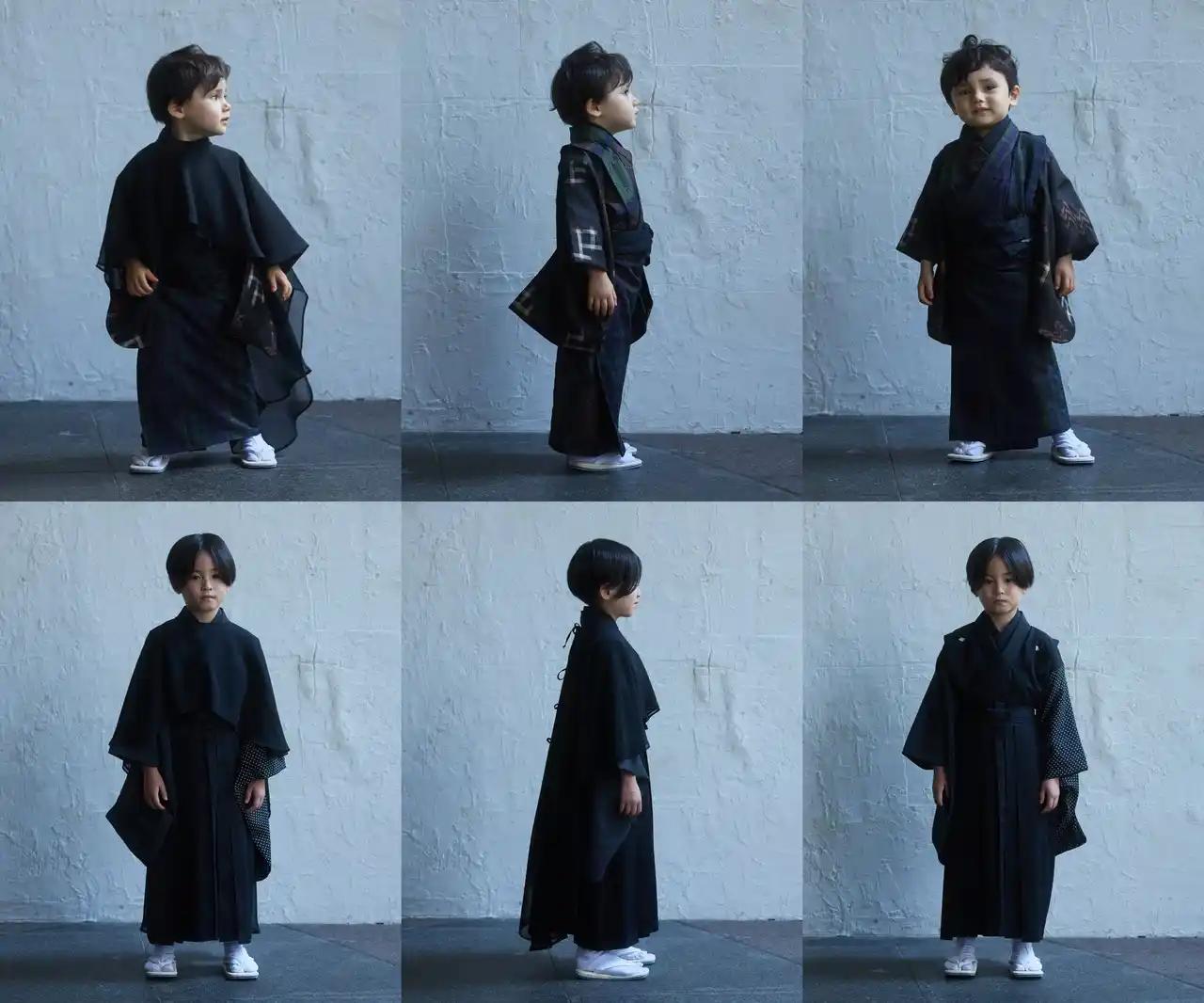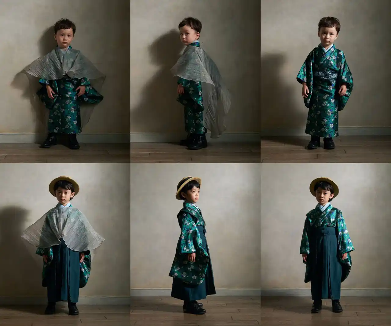 青緑色の生地に鮮やかに咲くアンティークローズの着物を、ふわりと揺れる淡いグレーのベールをあわせた、丸の内限定のboy衣装。薄靄のようなベールが、うちに秘めたお子様の個性をやさしく包み、躍動感と爽やかな佇まいを引き出します。 |