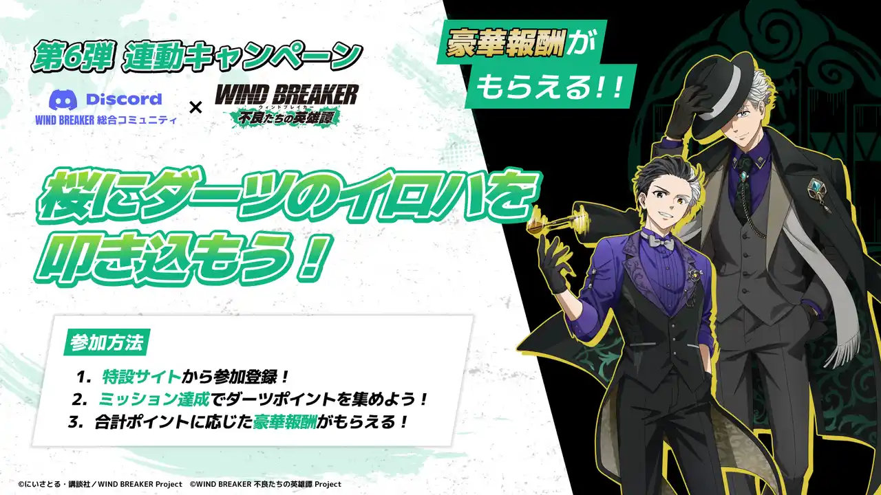 Discordコミュニティの企画・運営支援を行うナイル株式会社(本社:東京都品川区、代表取締役社長:高橋飛翔、以下ナイル)は、株式会社講談社(本社:東京都文京区、代表取締役社長:野間省伸)が提供するTVアニメ『WIND BREAKER』を題材としたオンラインゲーム『WIND BREAKER 不良たちの英雄譚』(略称、『ウィンヒロ』)とWIND BREAKER 総合コミュニティによる第6弾連動キャンペーン「桜にダーツのイロハを叩き込もう!」を8月29日より開催いたします。 |
