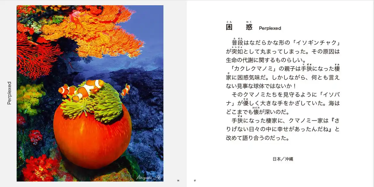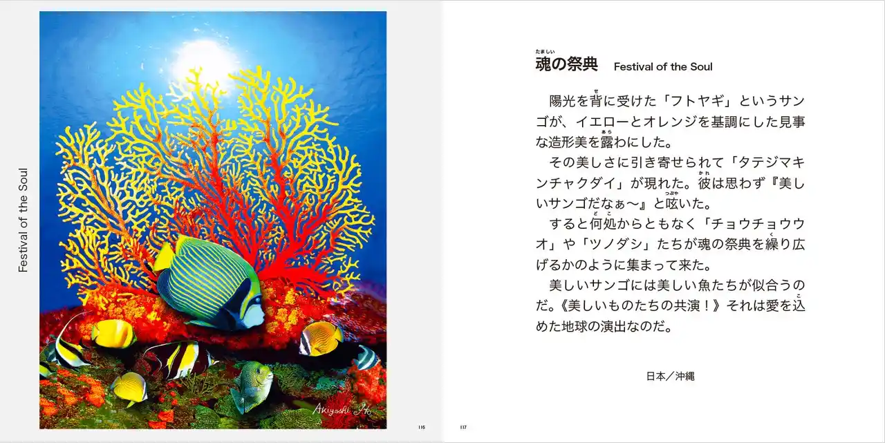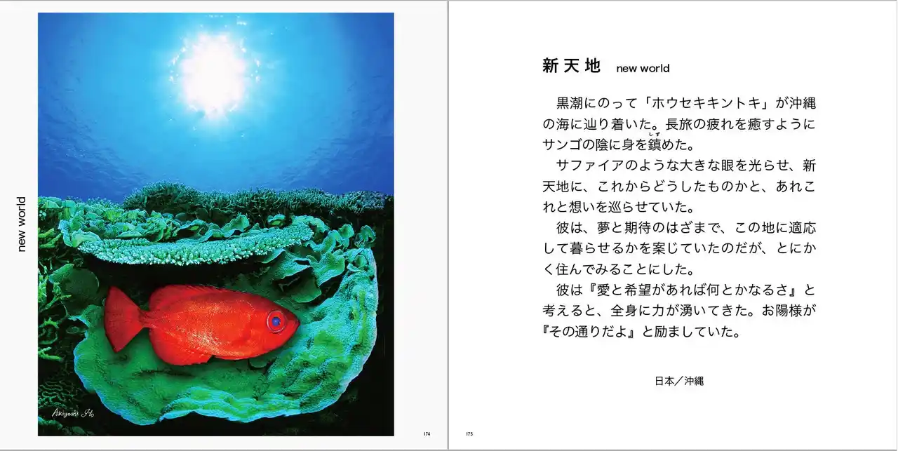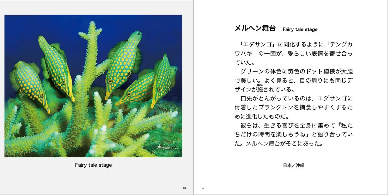 沖縄、伊豆、タイ、フィリピンなど、世界中の愛らしい魚たちが、豊かなコントラストで次々と現れます。人気者のカクレクマノミや、華やかなサンゴ礁に、めったに見られない熱帯魚など、ページをめくるごとに新しい出会いと驚きがあり、目を楽しませてくれます。自然が織りなす圧巻の造形には、心潤う繊細な美しさがあります。 |