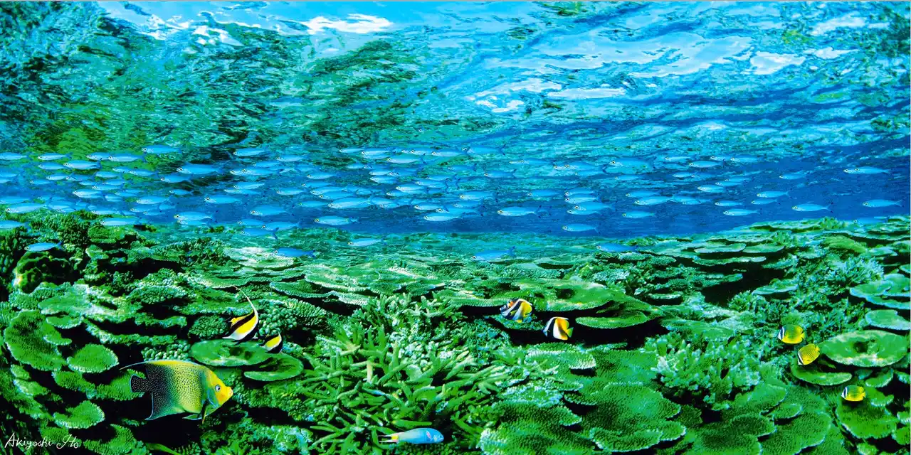 沖縄のサンゴ礁の海と出逢い、生命の原風景に心打たれた伊東は、海中の美の探求者となります。海中世界の色彩を発見し、「美術写真」という独自のジャンルを確立した伊東の作品は、アメリカのスミソニアン美術館、フランスのポルトドレ宮殿美術館、イタリアの国立アリナリ写真美術館、ユネスコ・パリ本部での海外個展開催などの機会を通じ、国際的に高い評価を得ています。 |