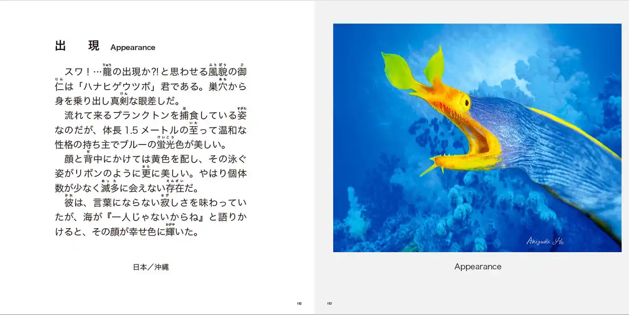 伊東が紡ぐストーリーは、温かな愛と喜びに満ちています。もちろん絵本や図鑑のように読むこともでき、まだ見ぬ生物や自然界への興味を育みながら、家族で安心して楽しめる作りとなっています。未知なる自然の美と息づかい、そして生きものたちが語りかけてくる様々なストーリーを描き出しました。母なる海は想像を超えた神秘にあふれ、深遠な生命の歴史を思い起こさせます。 |