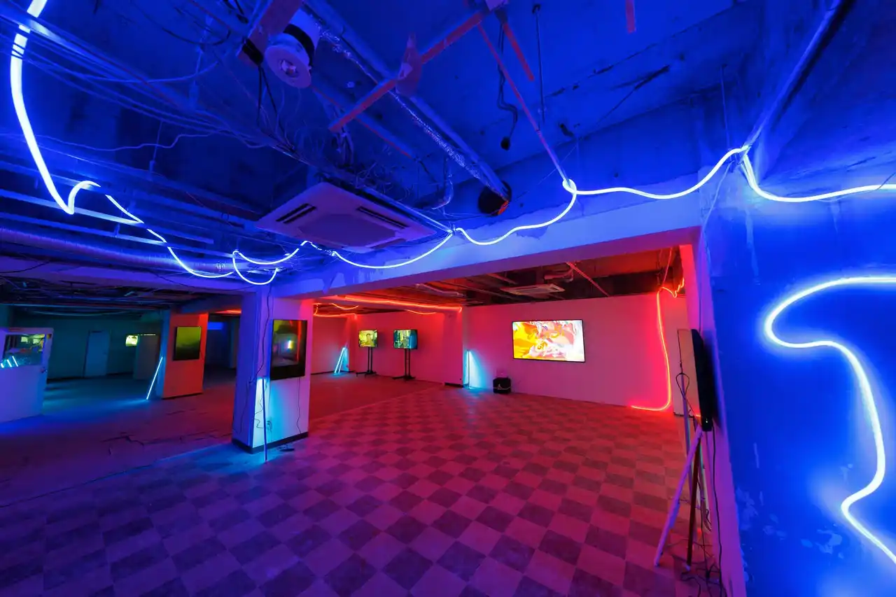 メイン会場となる「RIZE TOWER」では、アートフロア、レトロフロア、イベントフロア、マスターピースフロア、エクスプレッションフロア、デジタルビジュアルフロア、そしてギルド(バー)フロアで構成されています。フロアごとに明確に区切られているわけではなく、さまざまな体験が建物全体に散りばめられています。 |
