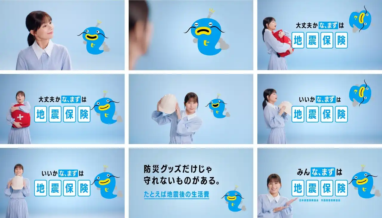 新CMは、日本で古くから「地震を予知する」と伝承されてきた「なまず」をモチーフとしたキャラクター「なまベェ」との軽快な掛け合いが特徴です。地震への備えとして「防災リュック」や「ヘルメット」を挙げる芳根さんに、「だけで、大丈夫か?」となまベェが問いかけることで、防災グッズだけでは被災後の生活までは守れないことに気づかされる内容となっています。最後は、もしもの災害への備えとして地震保険を想起していただけるよう、なまずとの語呂合わせによる「みんな、まずは地震保険。」という印象的なフレーズで強調します。 |