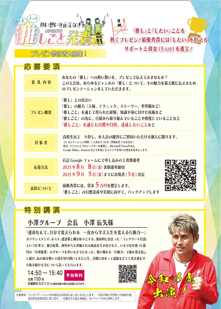 本イベントは「推しこと」や「実現したいこと」をテーマに、参加者が自らの夢や挑戦を熱くプレゼンテーションする発表会です。 小澤は特別講演にて、これまでの挑戦や経験を通して培った「行動力」や「逆境を力に変える姿勢」について語ります。 |