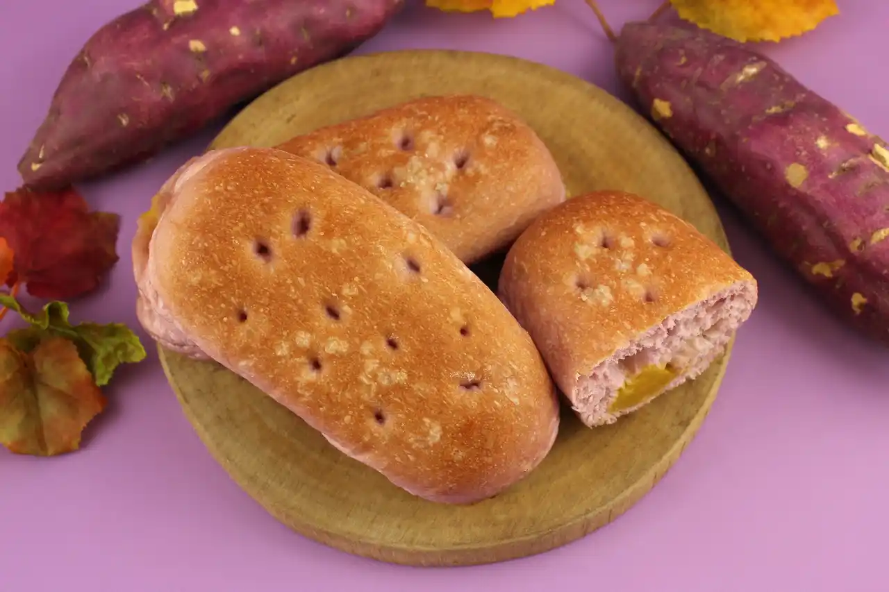 | 紫芋パウダーを練り込んだソフトなフランスパン生地に、シルクスイート(R)︎のペーストを使用したクリームとマーガリンを包み焼き上げました。シルクスイート(R)︎の優しい甘さを、マーガリンの塩味が引き立てます。 | |||||||||