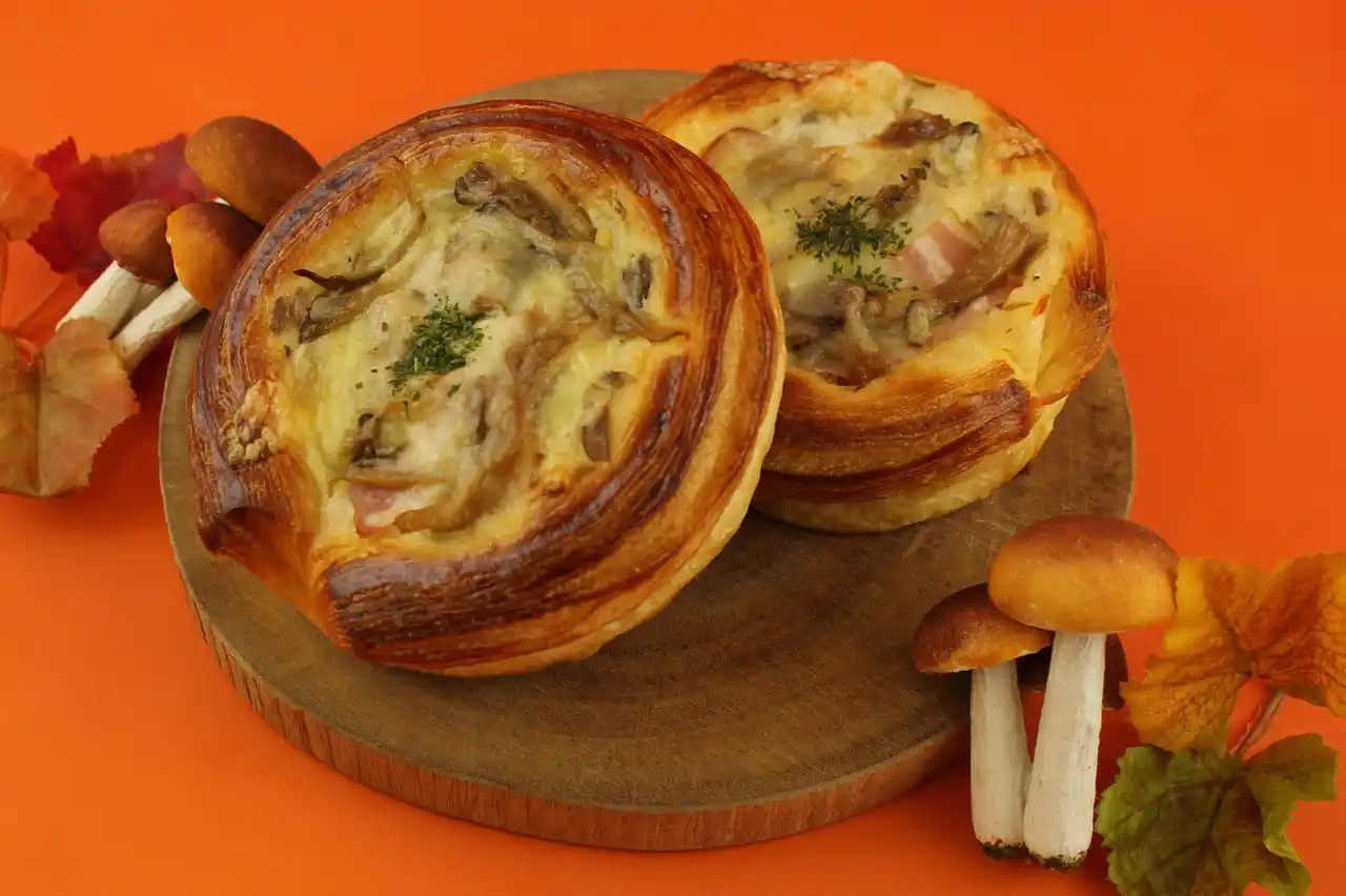 | デニッシュ生地にクリーミーなきのこサラダ、ベーコンをトッピングして焼き上げました。一口ほおばれば、サクッとしたデニッシュ生地と濃厚なきのこの美味しさが口いっぱいに広がります。トースターでリベイクして食べるのがおすすめ! | |||||||||