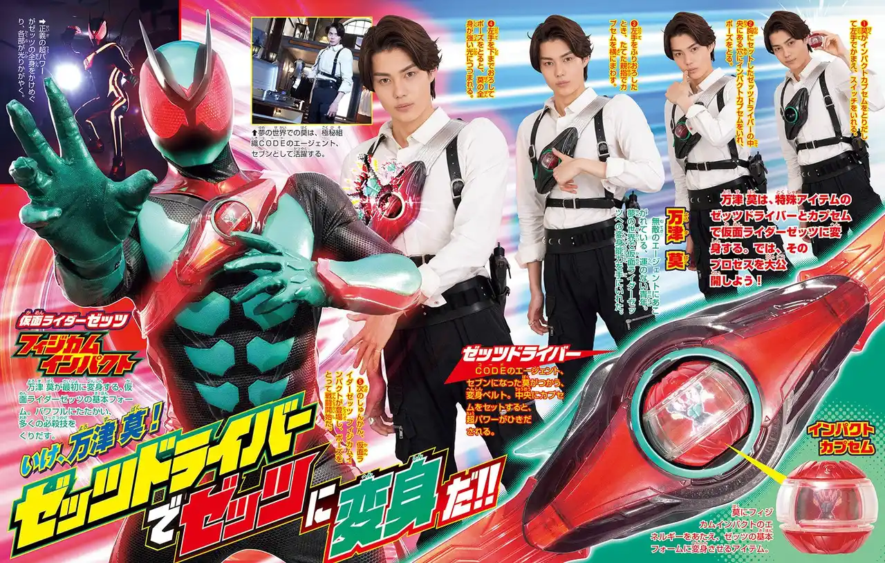 胸にセットした変身ベルト「ゼッツドライバー」と「インパクトカプセム」で変身するプロセスを詳しく解説するほか、悪夢から出現する怪人と戦うゼッツの戦闘パワー、カプセムのパワーで特殊能力が入れ替わる4大フォームを紹介します。 |