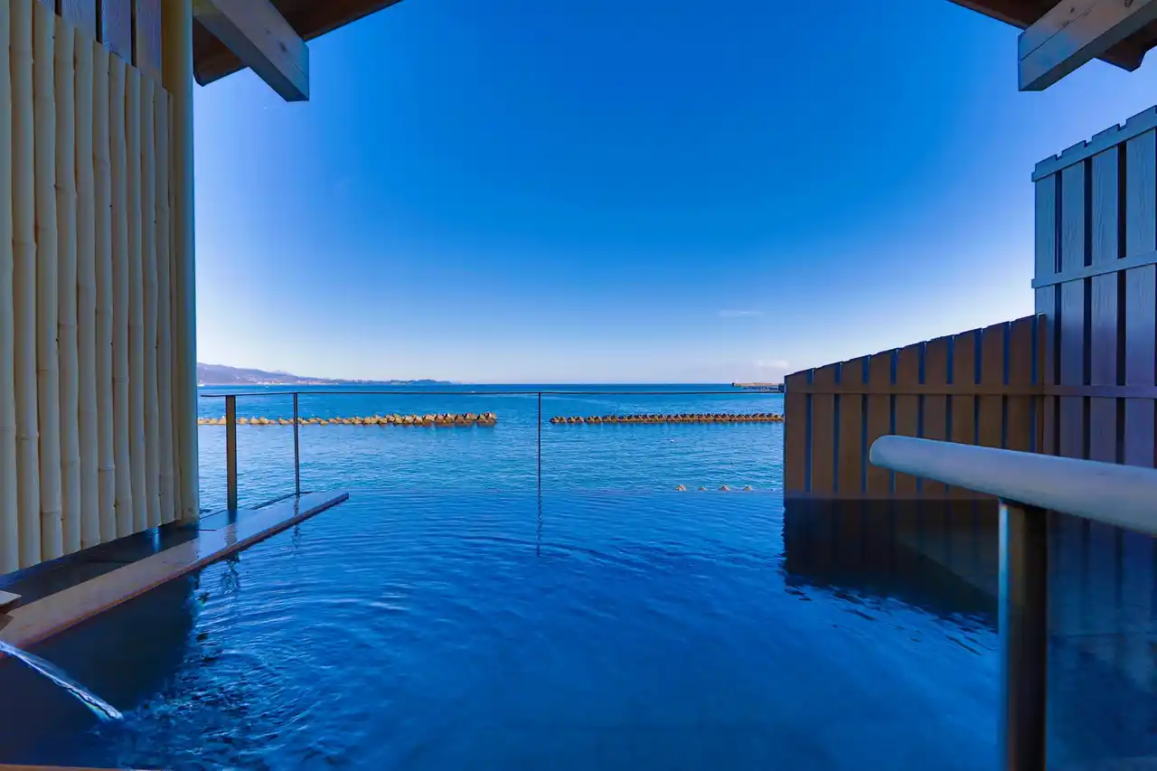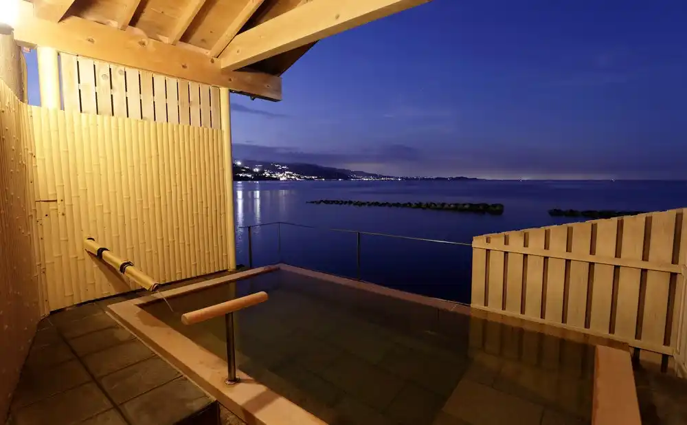 熱海では非常に珍しい、国道より海側に建っている最高のロケーションなので、伊豆半島随一のインフィニティ風呂です。当館を象徴する貸切露天風呂で、多くの利用者がインスタで絶景を共有して頂いています。湯舟のすぐ下に海があるため、熱海の景色と湯船が織り成すコントラストをお楽しみ下さい。 |