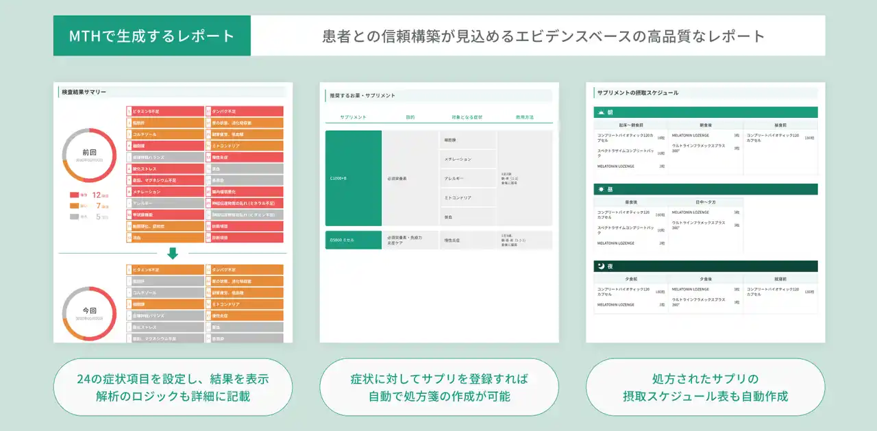 特に、これから栄養療法を始めるクリニックでも、専門人材や高度な知識がなくても質の高い診療を効率的に導入でき、既に栄養療法を行っているクリニックにとっては、診療精度や継続率をさらに高める強力なサポートとなります。 |