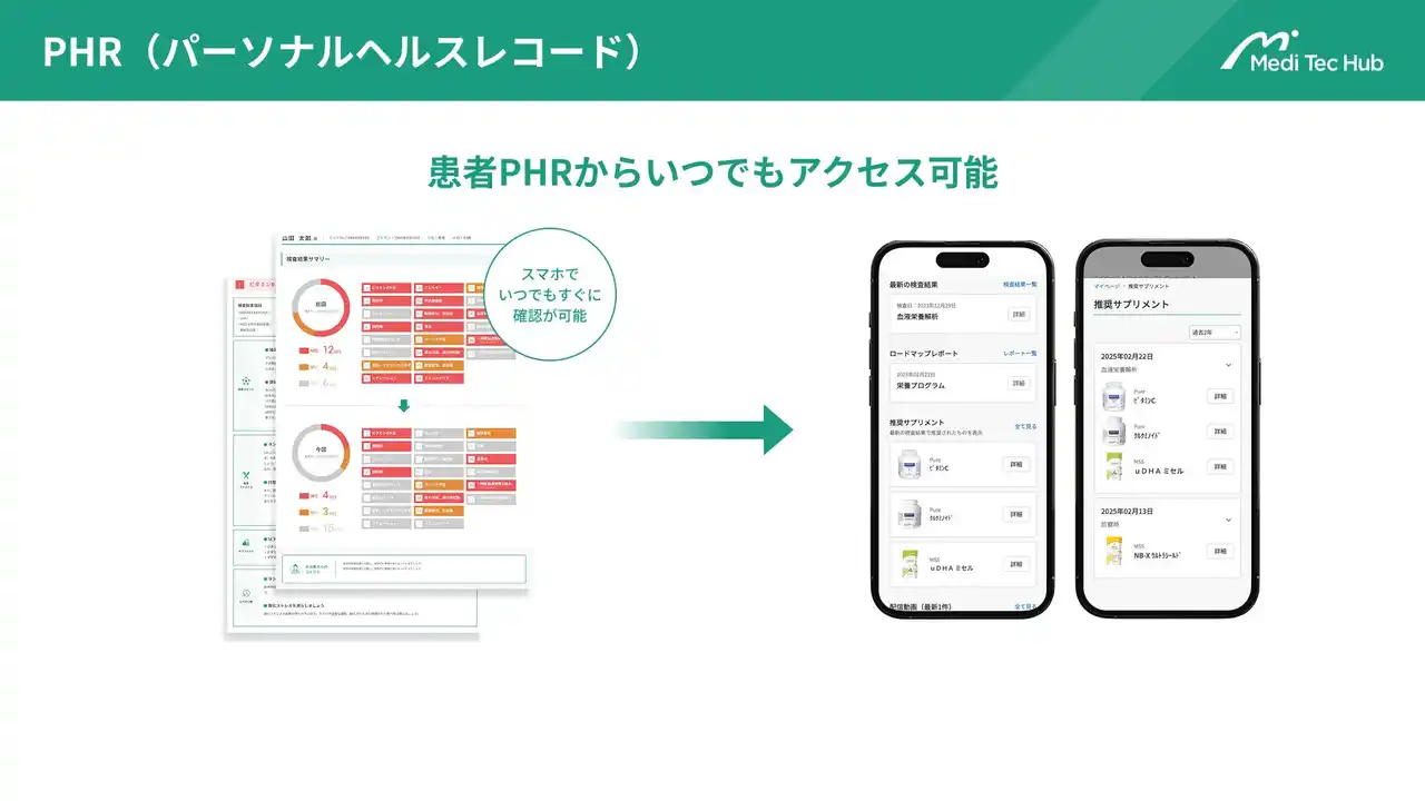 血液栄養解析レポートは、メディテックハブに搭載されているPHR(パーソナル・ヘルス・レコード)と連携し、患者がスマートフォンから自身の治療計画を随時確認できる仕組みを提供しています。 |