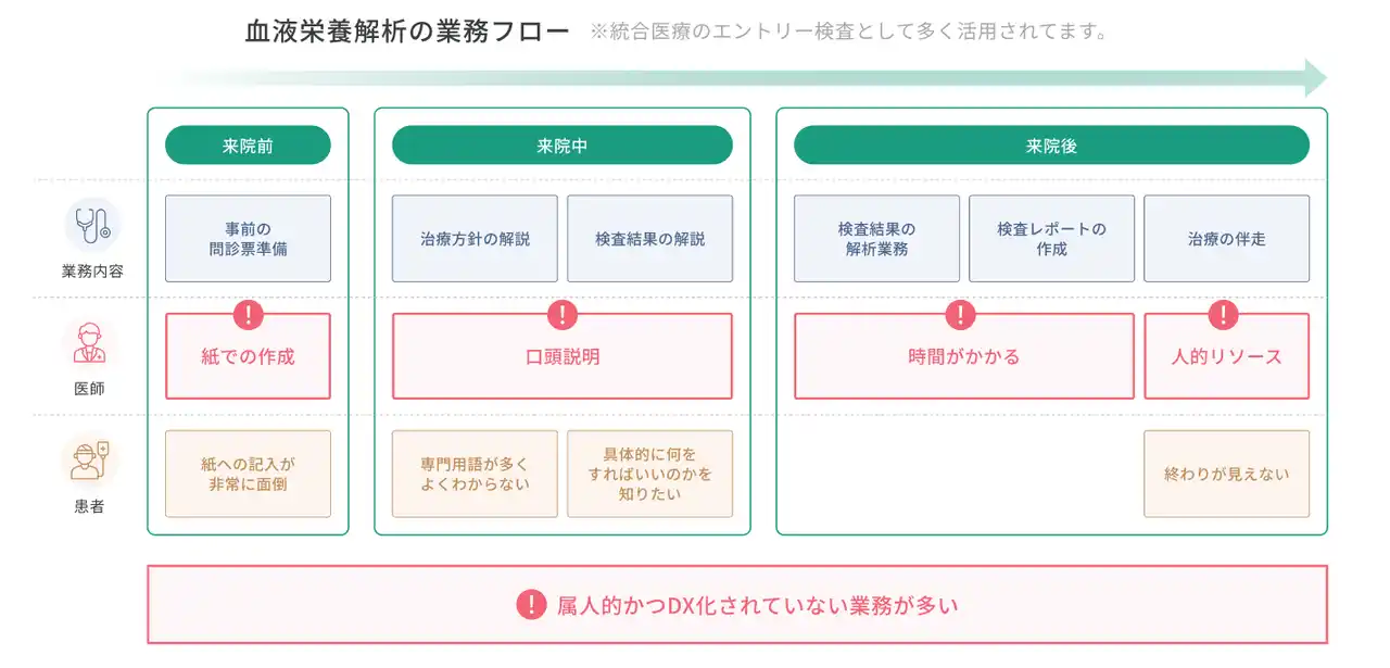 分子栄養学や機能性医学に基づく自由診療は全国で広がりつつありますが、現場では診療設計や説明が医師個人の経験や属人的な知識に依存しているのが実情です。そのため、再現性や患者の納得感を確保しにくく、治療継続率にも差が生じています。さらに、検査データの解釈やレポート作成は時間と労力を要し、医療従事者の業務負荷も大きいままです。 |