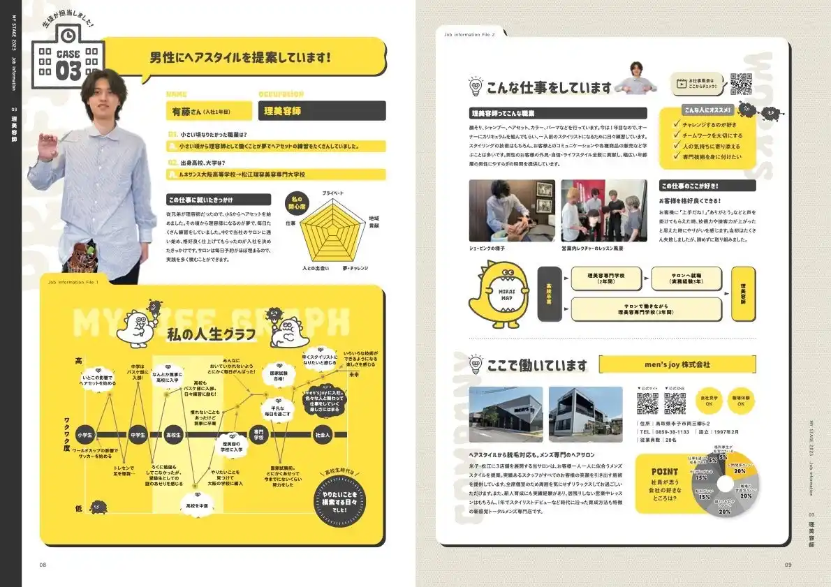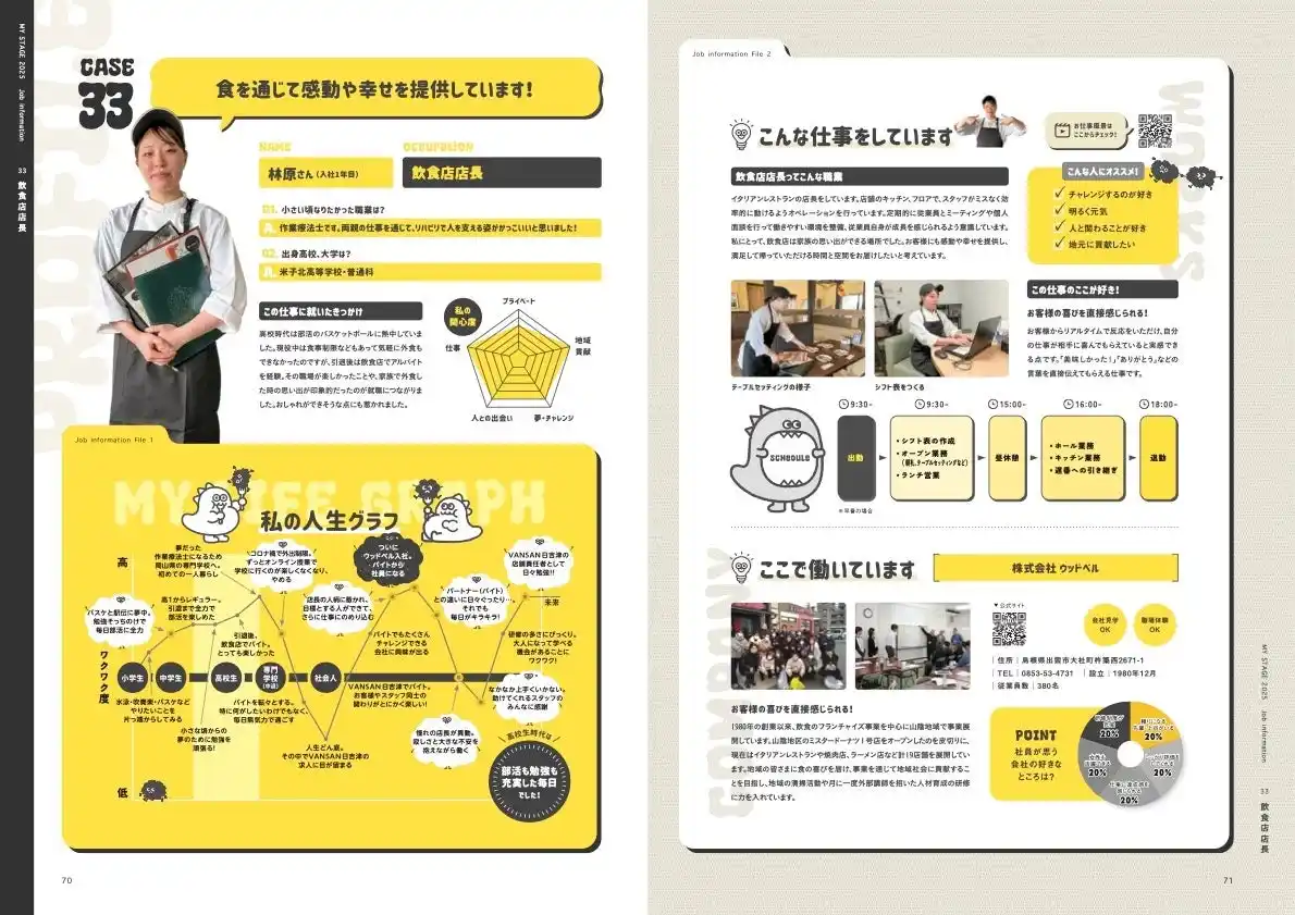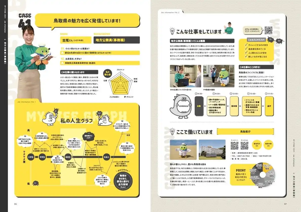 昨年は、「職種を知ること」「企業を知ること」ができる仕様でしたが、第2号では、さまざまな経験や人との出会い、紆余曲折を経て現在、山陰地域で活躍するロールモデルを多数掲載。単に職業の魅力を伝えるのではなく、実際に企業で働く方々に焦点を当て、『職業に就くまでの道のり』や『挫折・失敗談』などのリアルなストーリーを紹介しています。そうした体験談を通じて、高校生が「新たな発見」と「将来への希望」を感じられる内容となっております。 |
