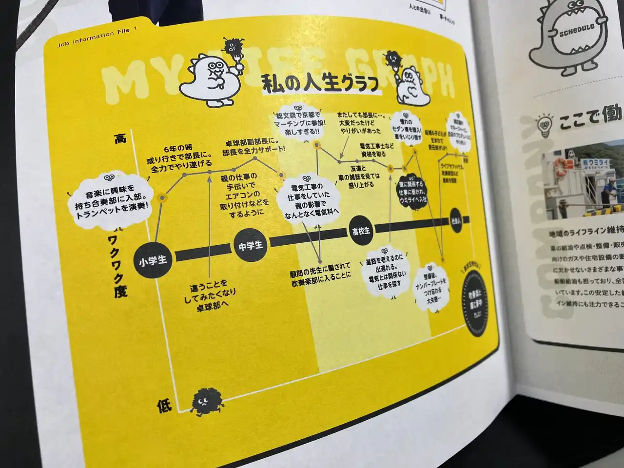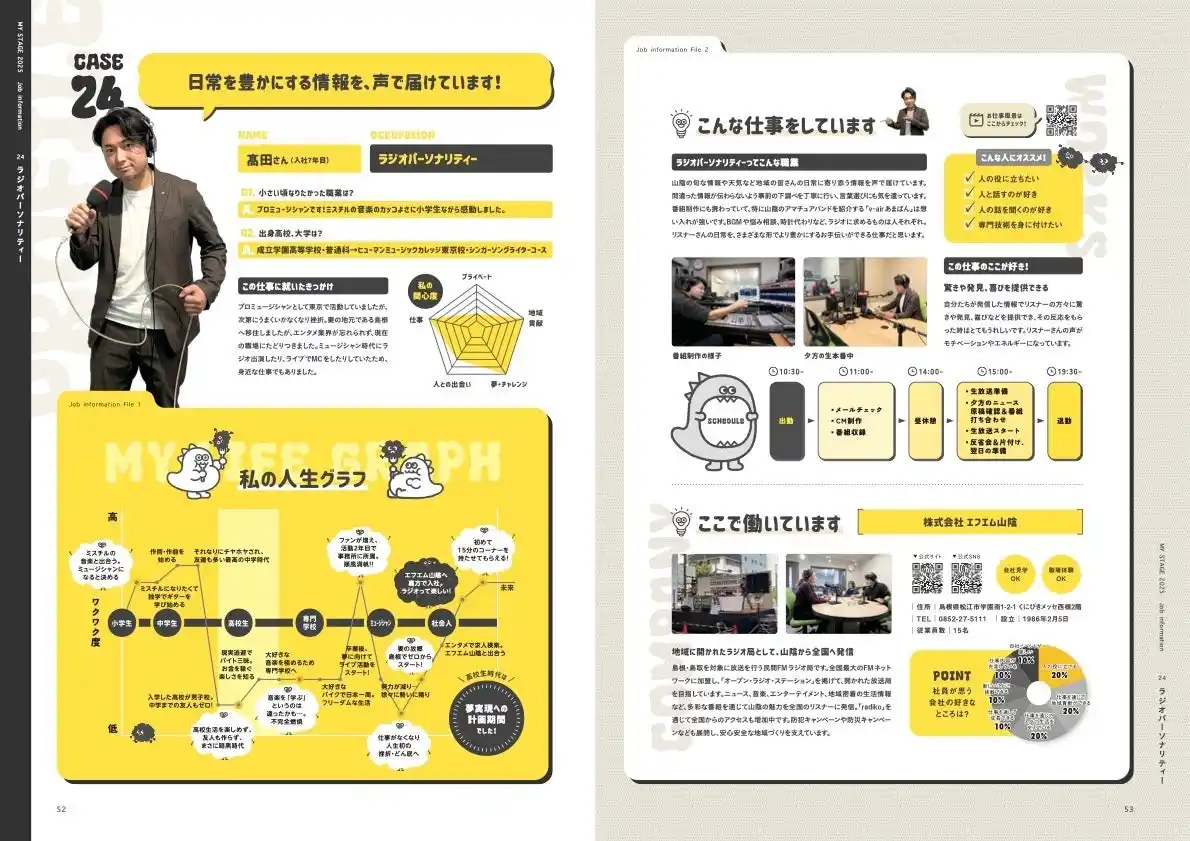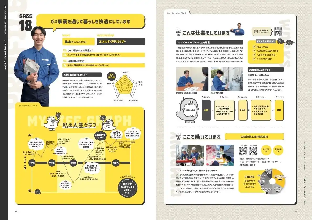 昨年は、「職種を知ること」「企業を知ること」ができる仕様でしたが、第2号では、さまざまな経験や人との出会い、紆余曲折を経て現在、山陰地域で活躍するロールモデルを多数掲載。単に職業の魅力を伝えるのではなく、実際に企業で働く方々に焦点を当て、『職業に就くまでの道のり』や『挫折・失敗談』などのリアルなストーリーを紹介しています。そうした体験談を通じて、高校生が「新たな発見」と「将来への希望」を感じられる内容となっております。 |