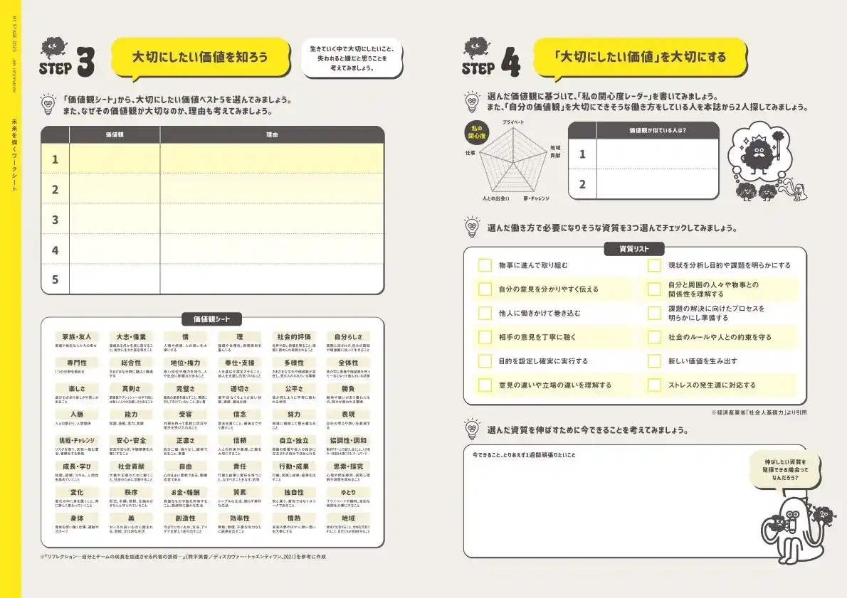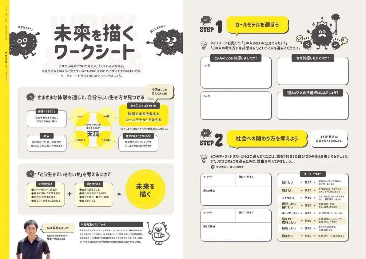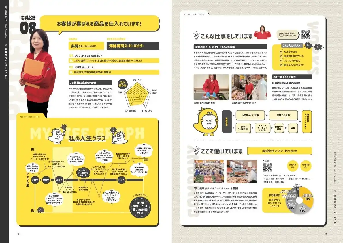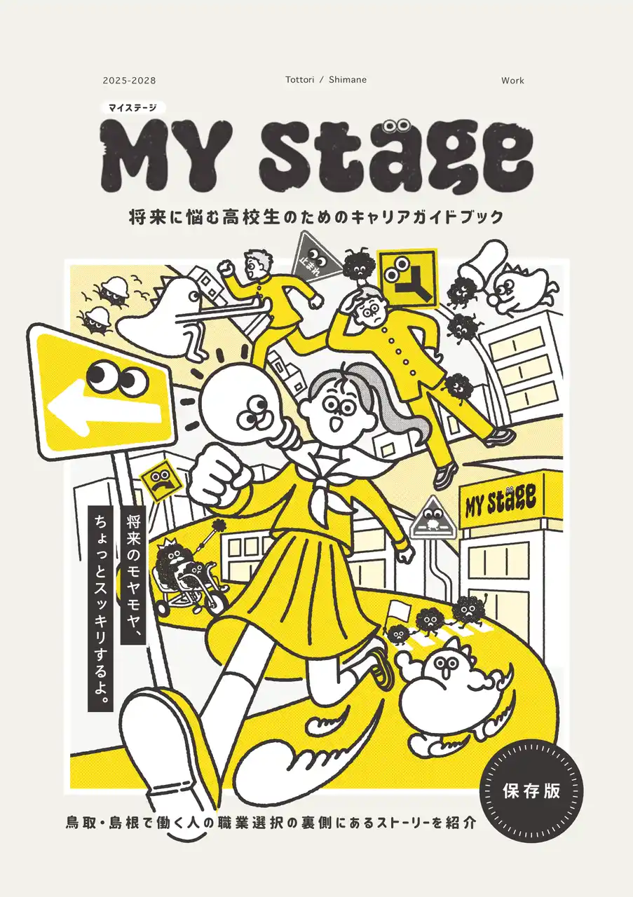 冊子中央にある「学生インタビュー」では、本号のコンセプトに共感し企画協力してくださった「米子北高等学校」の生徒たちが企業取材にチャレンジ。また、冊子の終盤には、島根大学大学教育センター・中村怜詞准教授が監修した「未来を描くワークシート」を掲載。マイステージを活用して自身の個性を知り、職業選択のヒントや新たな選択肢を広げるきっかけになることを目指しています。さらに本誌は、高校の探究授業や進路指導で活用しやすい内容となっており、先生方には「キャリア教育を担う一冊」として授業等での利用を期待しています。 |