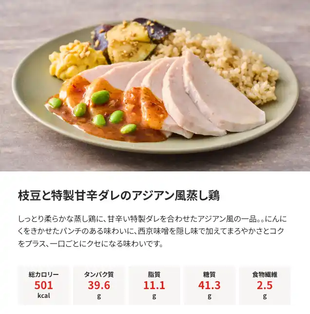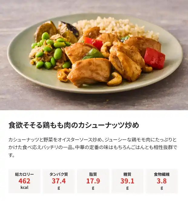 厚生労働省の推奨する「1日のタンパク質摂取目安(50~65g)」を、1食でしっかり補えます。 脂質も1日の推奨範囲(44~67g/2000kcal基準)の中で適正に収まるため、 |