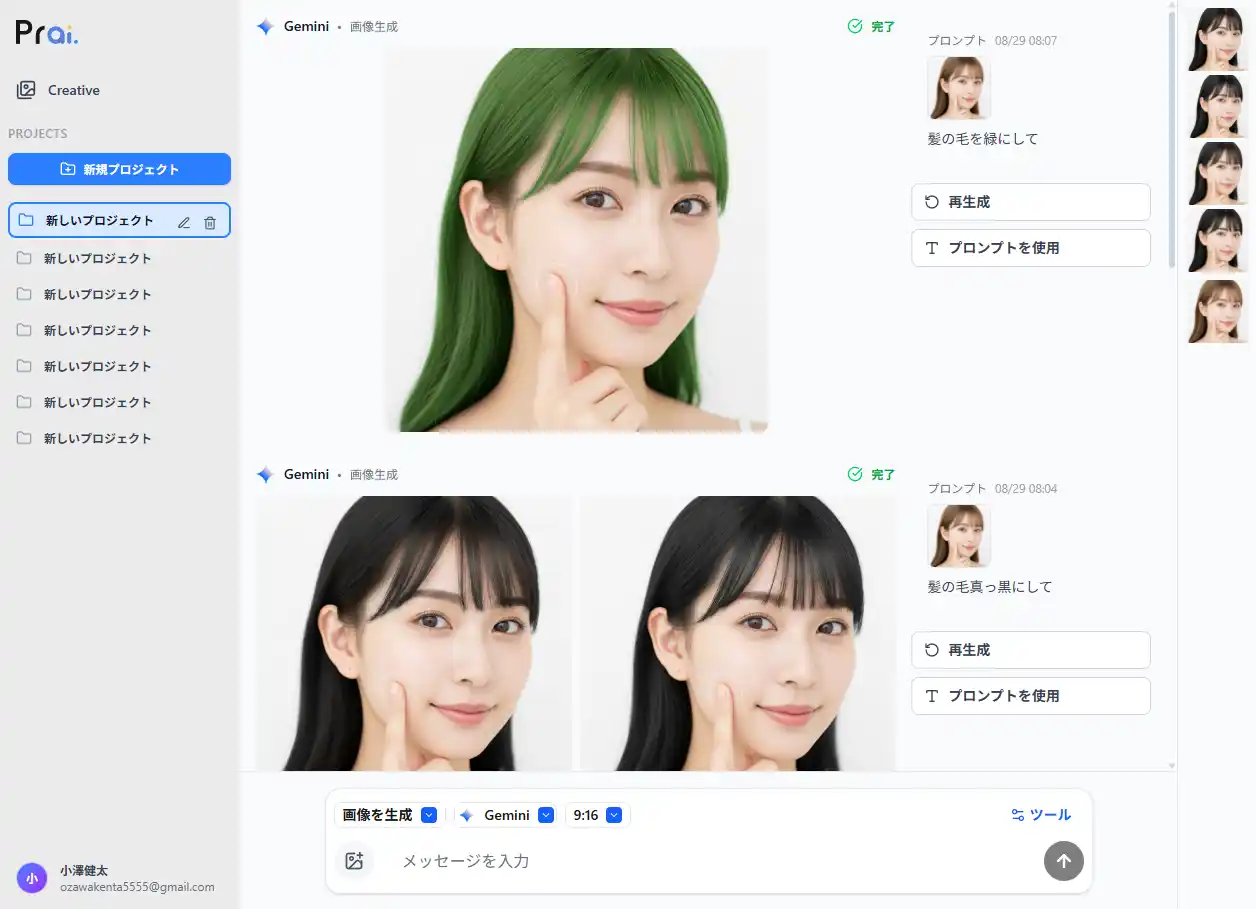 この度「Pro AI」に搭載された「nano-banana」は、Googleが開発した最先端のAI技術です。特定のキャラクター、オブジェクト、スタイルなどを「ID化」して記憶させることで、何度生成を繰り返しても、その特徴を完全に維持した画像を生成することができます。 |