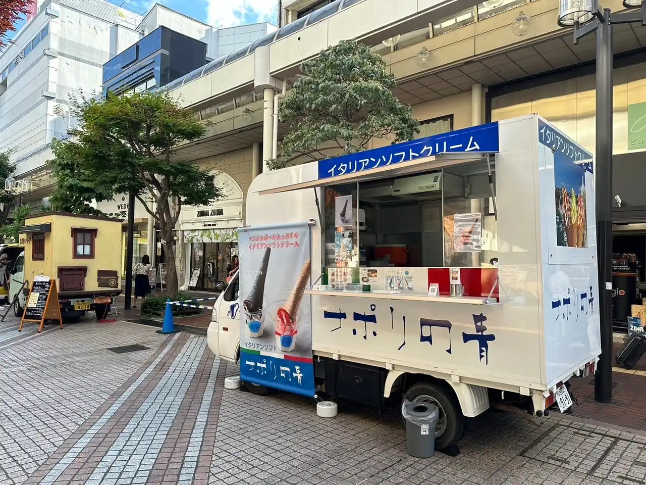 期間限定で営業しているキッチンカーでは、マスカルポーネ・ティラミス・仙台いちご・オリーブオイルの4種類を販売。イタリアンソフトクリームのほかに『レストランパリンカ』監修の仙台牛のボロネーゼも提供。 |