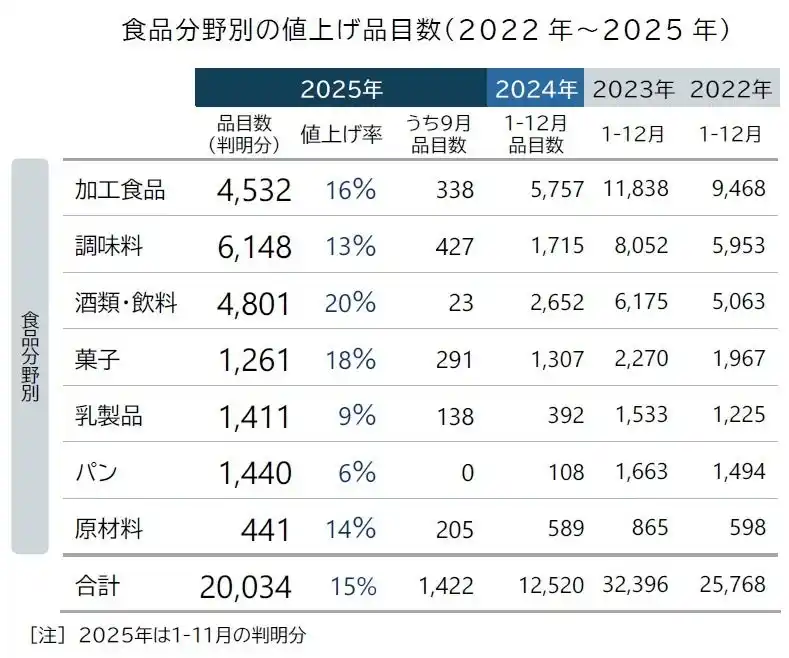 通年では、2025年の値上げは11月までの公表分で累計2万34品目となった。前年の実績(1万2520品目)を60.0%上回り、2023年(3万2396品目)以来、2年ぶりに2万品目を超えた。 |