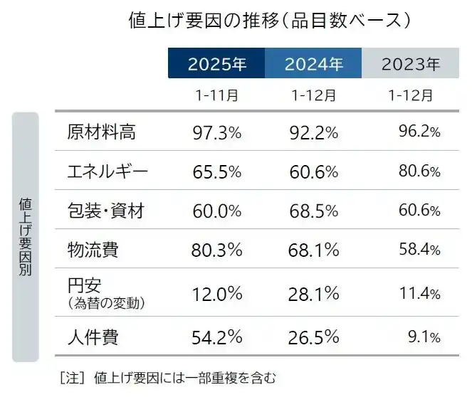 2025年の飲食料品値上げは、原材料高に加えて物流費や賃上げによる労務費など、粘着性が高く、国内の経済情勢に起因した圧力が強まっている。国際的な小麦・食用油や原油価格の急騰、急激な円安による輸入物価の上昇など、一過性とみられた外的要因による物価高が主だった2023年~2024年前半の値上げラッシュから、持続的で内的要因によるインフレ傾向に変化した。そのため、継続的な価格引き上げが不可欠となっていることも、比較的低位に抑制された前年から値上げ品目数が大幅に増加する要因となっている。 |