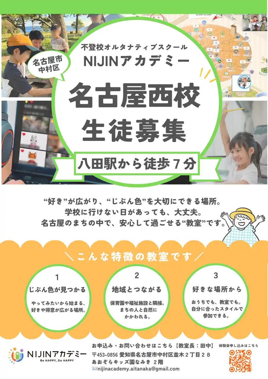 | 株式会社NIJIN(本社:東京都江東区、代表取締役:星野達郎)が運営する、不登校オルタナティブスクール『NIJINアカデミー』は、2025年9月1日(月)、愛知県名古屋市中村区にリアル教室「名古屋西校」を新規開校いたします。 | ||||||||||||