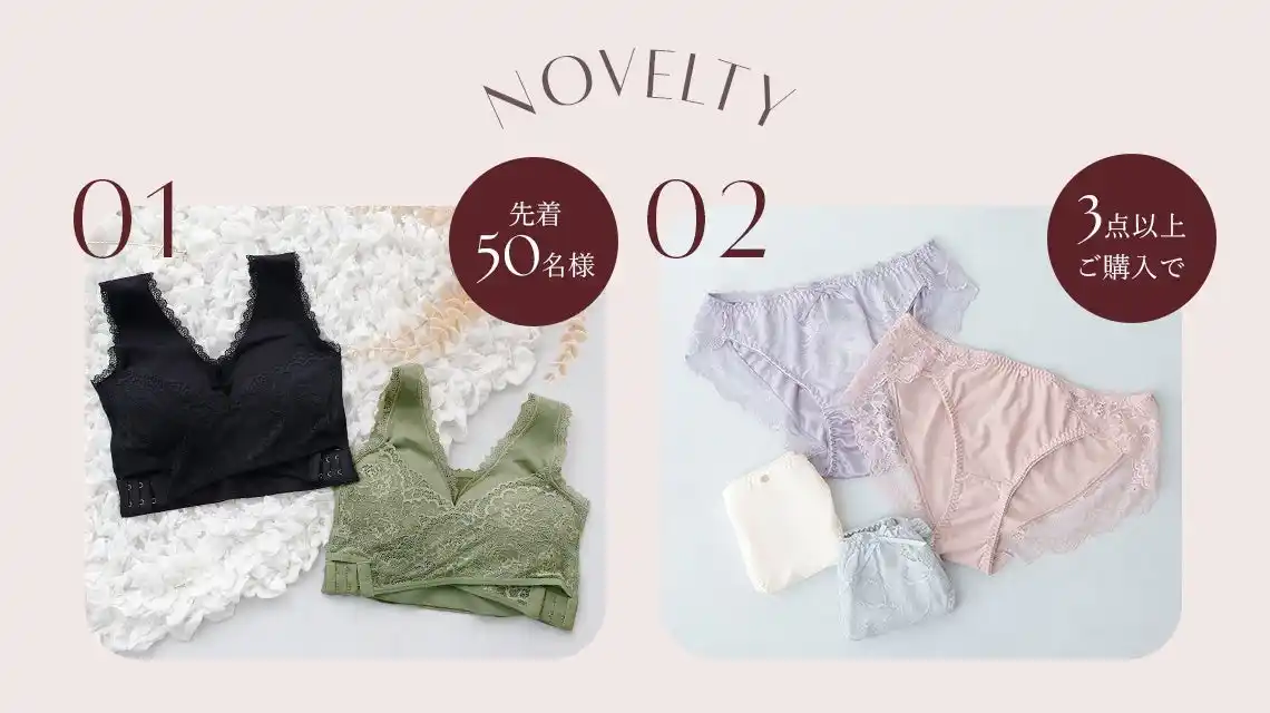 | 初日限定で、店内商品を¥5,500 以上ご購入いただいた先着50名様に、レビュー評価★4.48以上の人気ナイトブラをプレゼント。ご用意分は即日完売となりました。 | |||||||||