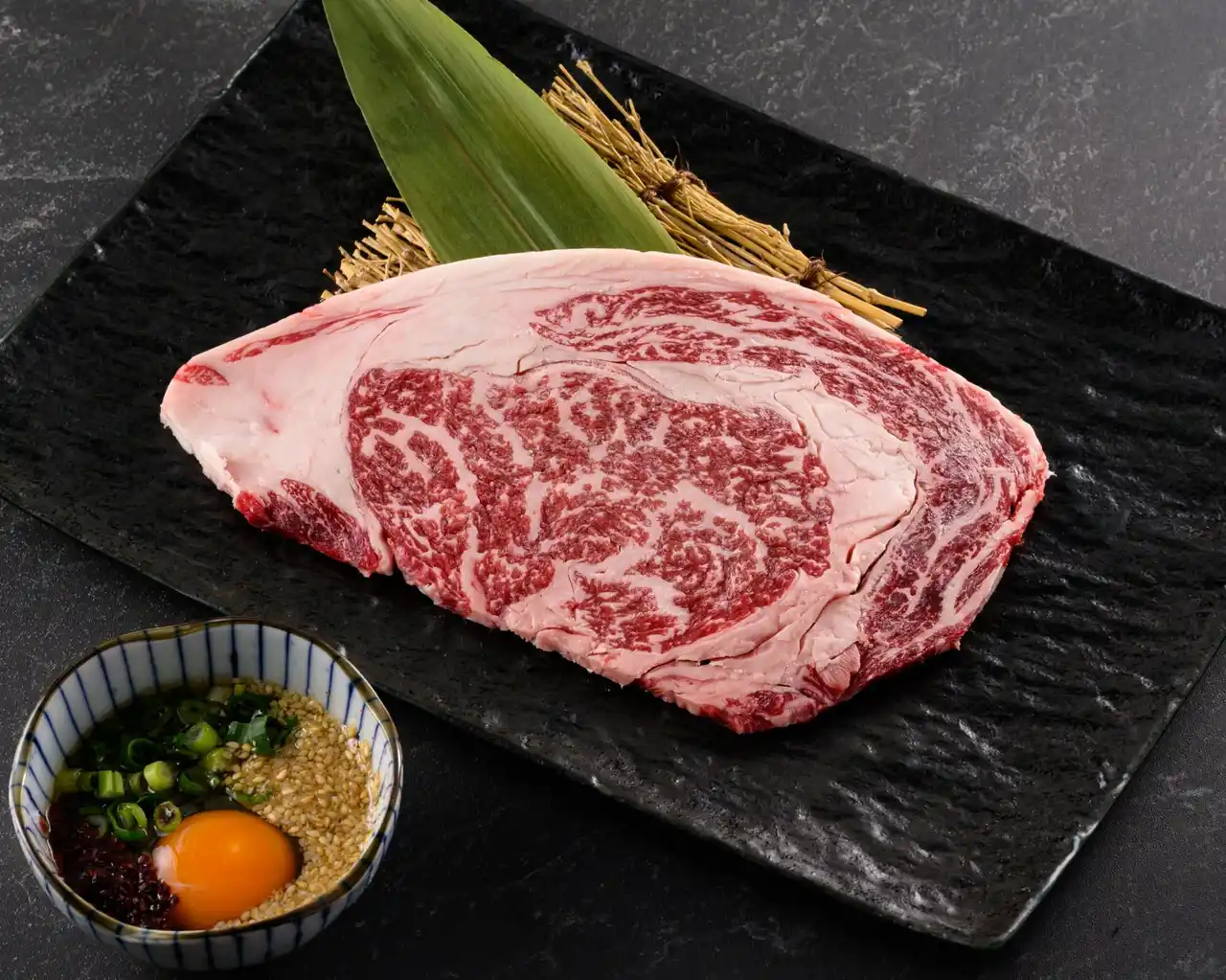 | ジューシーなリブロース100gを特製月見ダレで堪能する、迫力ある一皿。 | |||||||||