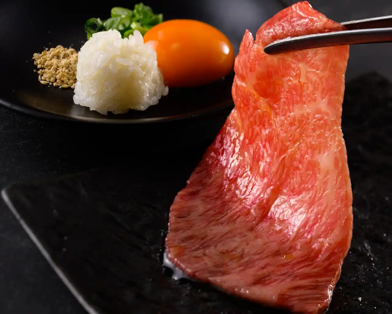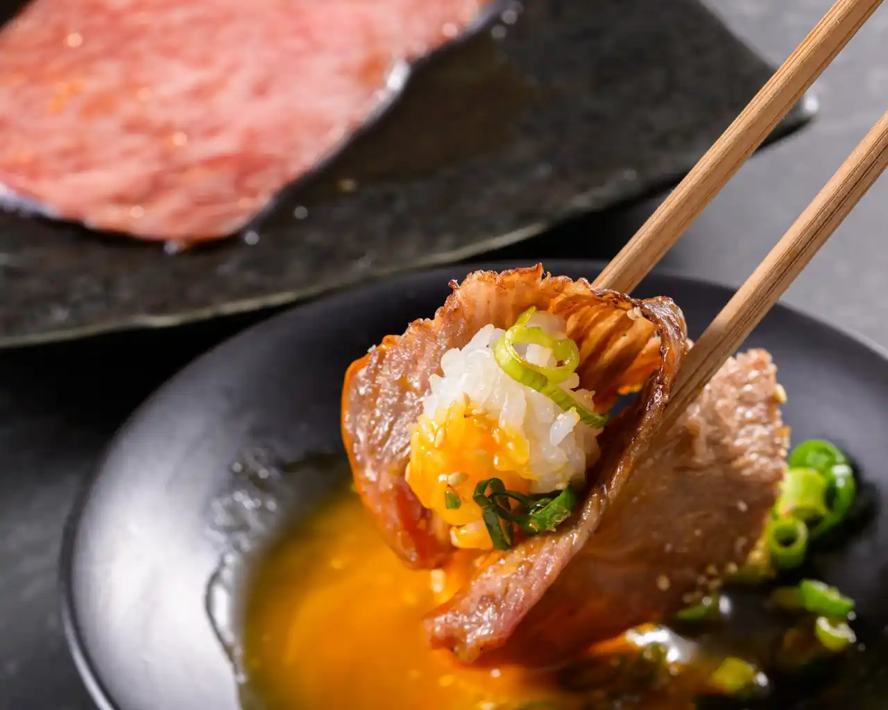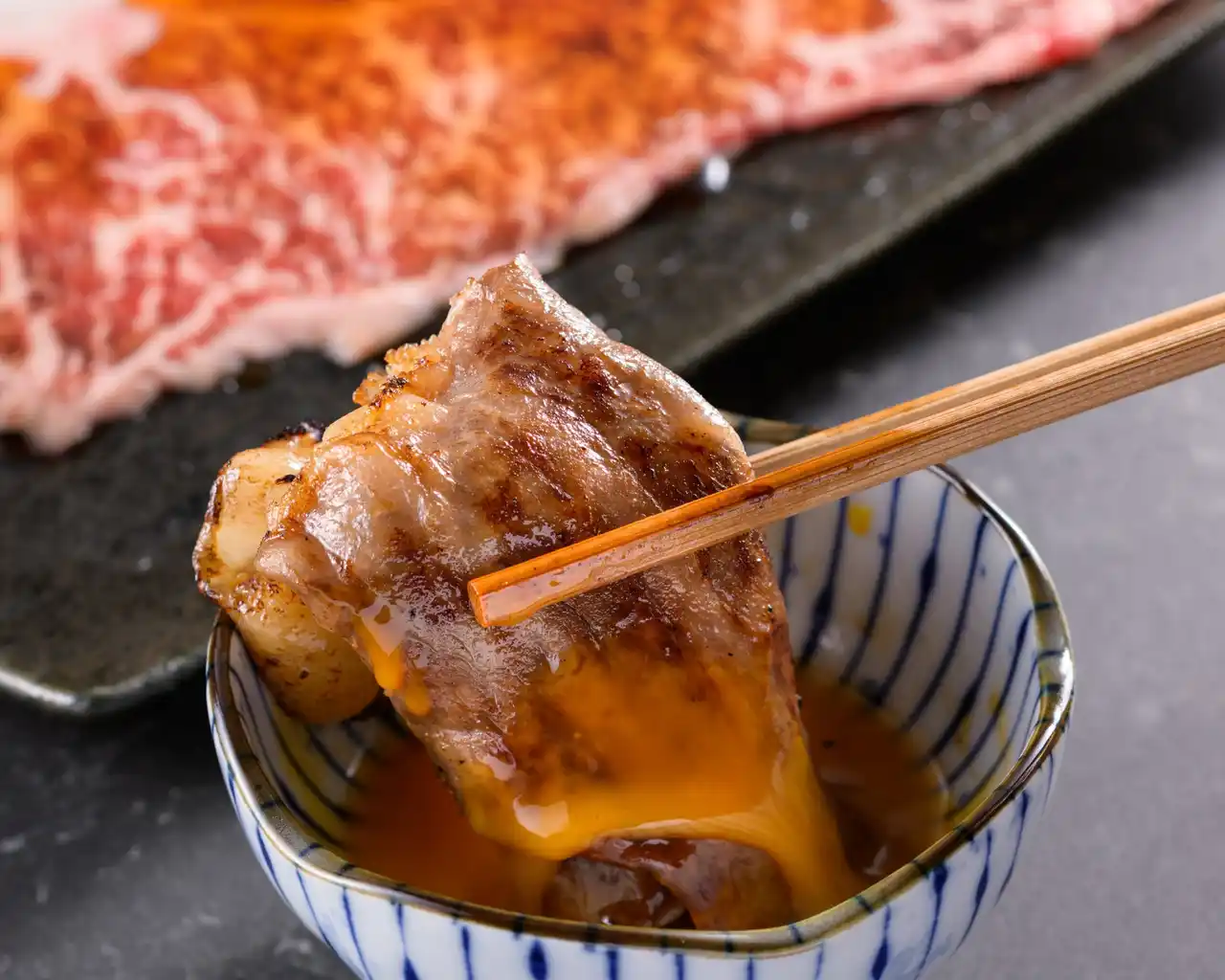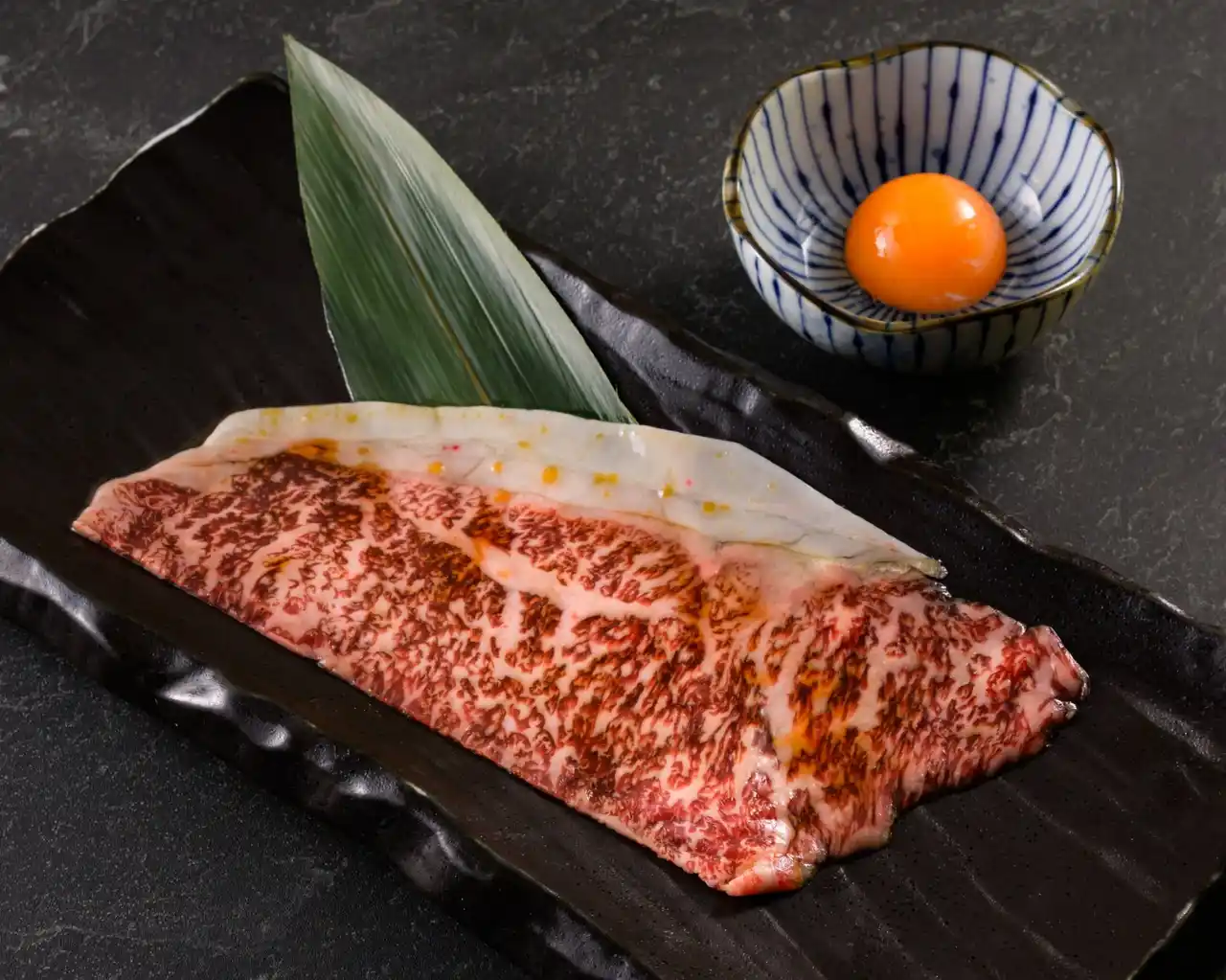 | 銘柄黒毛和牛のサーロインをサッと焼いて、卵黄に絡めて食べると、とろけるような食感とともに上質な甘みと旨味が口いっぱいに広がる。 | |||||||||