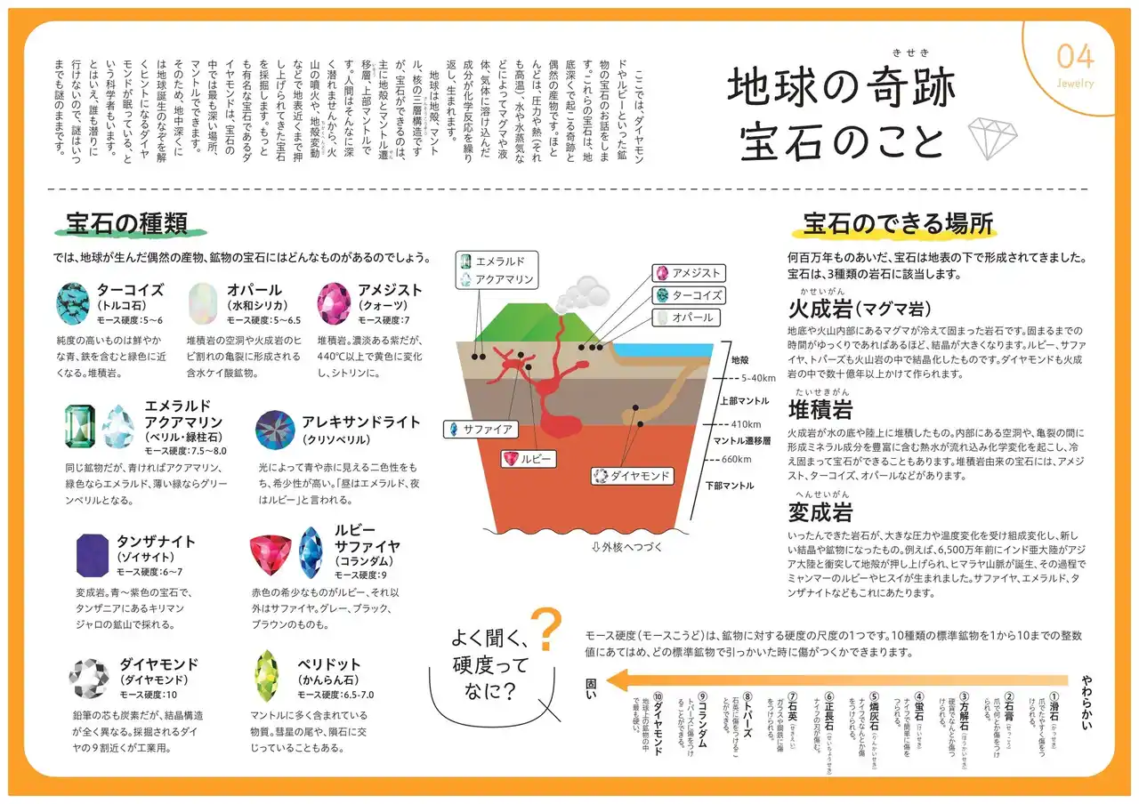| テーマ4.では、真珠とともにジュエリー商材で取り扱う“宝石”をテーマに、宝石の種類や生まれるまでの軌跡を説明。ルビー/サファイアをはじめとする宝石は地中深くで生まれるため、火山活動や地殻変動の奇跡が重なり採掘出来るようになること、出来る場所、よく聞く宝石の硬度とはなにかについて解説。 | |||