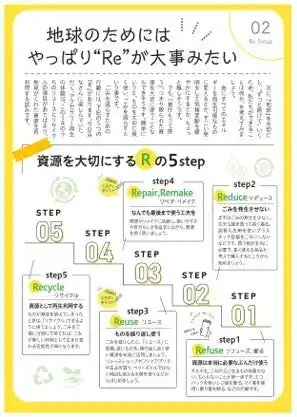 | テーマ2.では、資源を大切にするアクションをRの5つのステップで解説。資源は本当に必要な分だけ使う「Refuse リフューズ、断る」、ごみを発生させない「Reduce リデュース」、ものを繰り返し使う「Reuse リユース」、なんでも最後まで使う工夫「Repair、Remake」、資源として再利用する「Recycle リサイクル」。 | |||