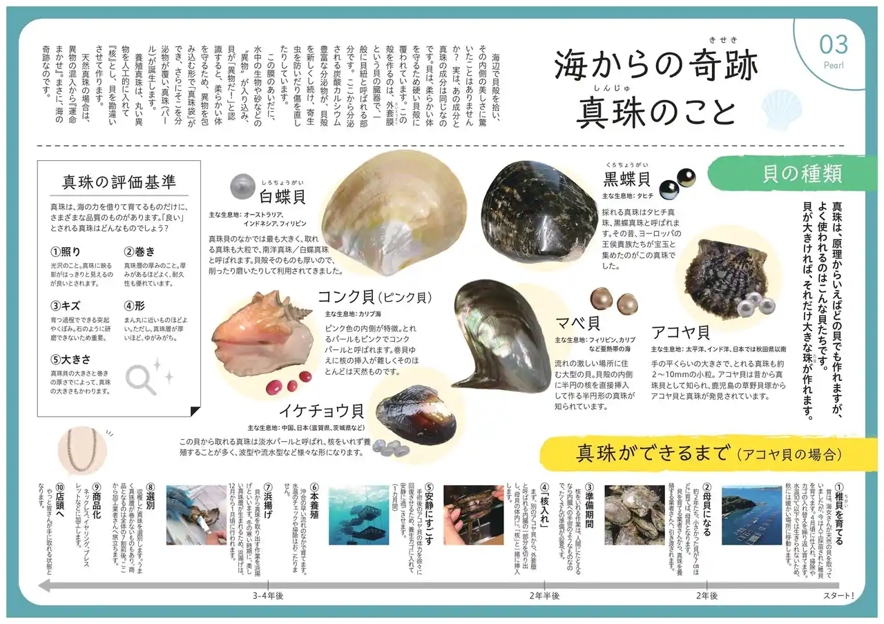 | ネックレスやジュエリーに使用される真珠がいくつもの奇跡の上に成り立っていることを伝え、素材の大切さを学ぶことが出来ます。 | |||