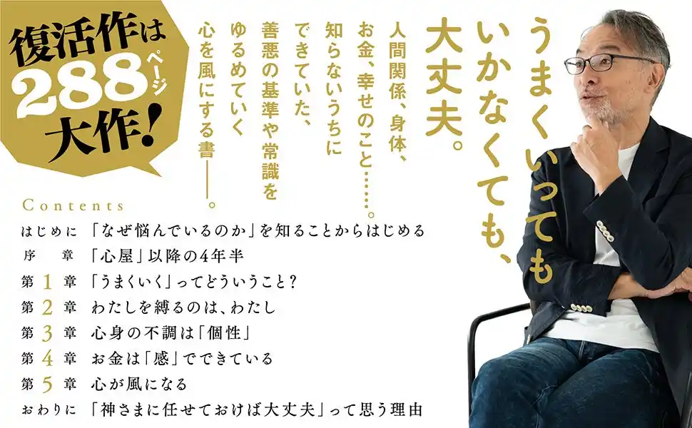 本作は2020年までに著書約70冊、累計600万部を売った元心理カウンセラー「心屋仁之助」が、名義を「Jin佐伯仁志」に変更し、久しぶりとなる著書です。「心屋仁之助」としての活動に終止符を打ってからの数年間、ライブハウスで歌い、オリジナルアルバムを作成するなど、音楽を中心に活動を行ってきました。 |