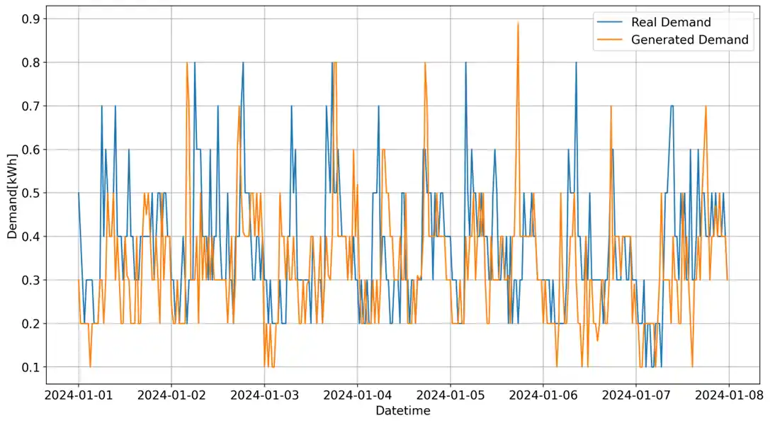実際の電力需要と生成AIモデルの比較。実データに近い形を再現している |