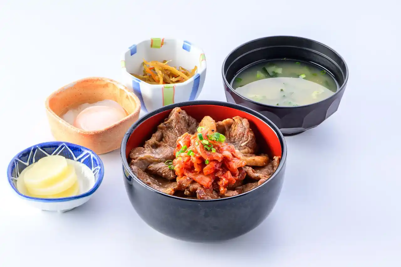 ピリ辛スタミナ豚丼(小鉢・味噌汁・漬物・温泉卵付) |