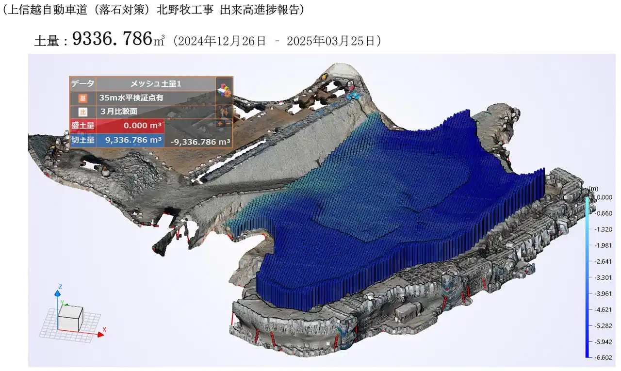 ・現場への自動充電ポート付きドローンの設置 ・週次でのドローン遠隔運航による測量撮影およびパノラマ写真の撮影 ・撮影した写真による3次元モデルの生成 ・3次元モデルによる掘削量の算出 ・のり面状況の詳細な撮影 |