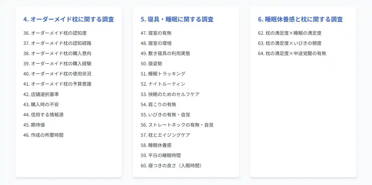 枕市場の健全な発展に寄与することを目的とした全147ページの本レポートは、「利用実態」「満足度」「購入動機」「衛生意識」「オーダーメイド枕への関心」など、全61項目 にわたる独自の調査データを掲載。製品開発やマーケティング担当者が明日から使える、示唆に富んだ考察を加えています。 |
