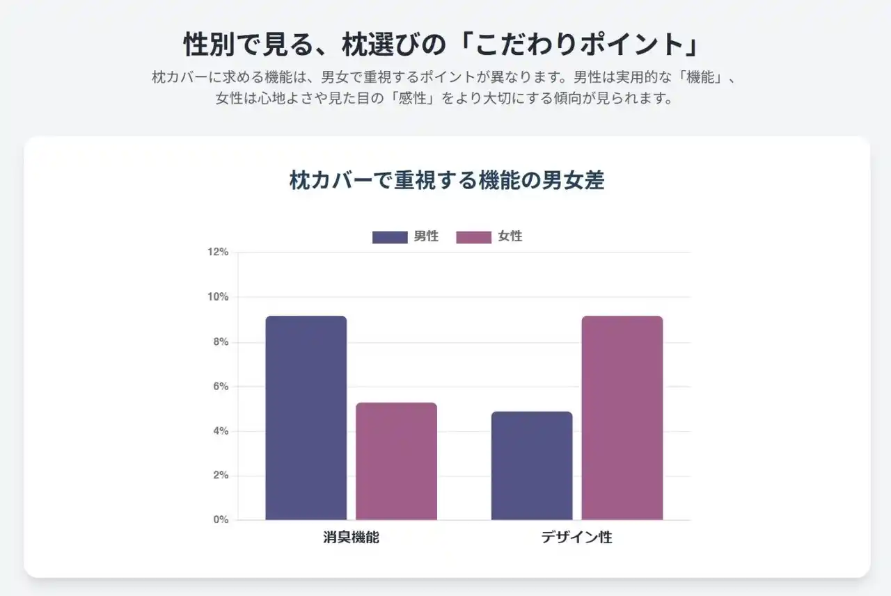 | 枕カバーで重視する点について、男性は「消臭機能(9.2%)」を女性(5.3%)より重視する 一方、女性は「デザイン性(9.2%)」を男性(4.9%)より重視する など、訴求すべきポイントが異なります。 | |||