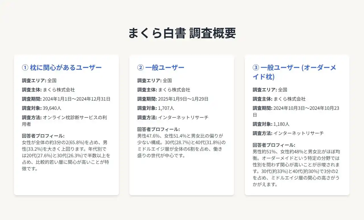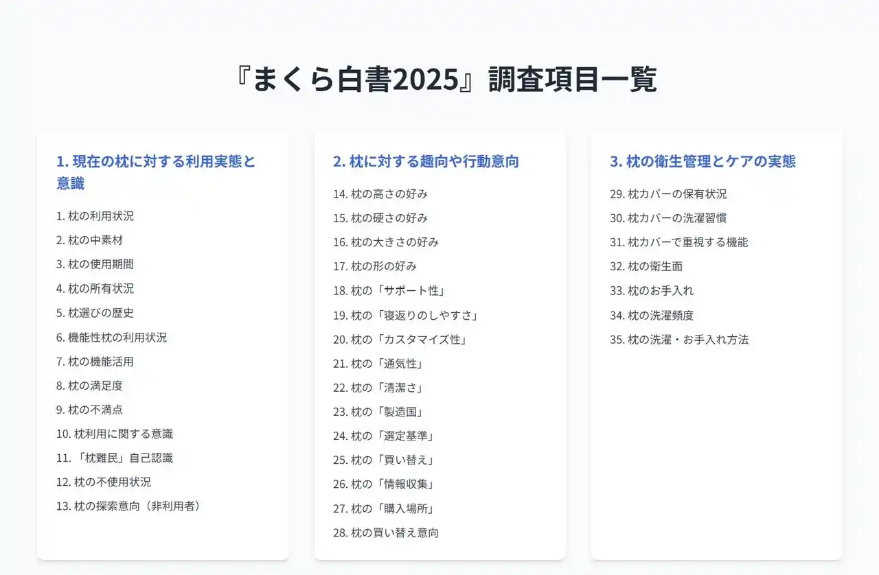 | 「まくら白書2025」は、枕に関心を持つ約4万人の声を集積・分析し、現代の枕市場が抱える構造的課題と、そこに潜む巨大なビジネスチャンスをデータで可視化するものです。 | |||